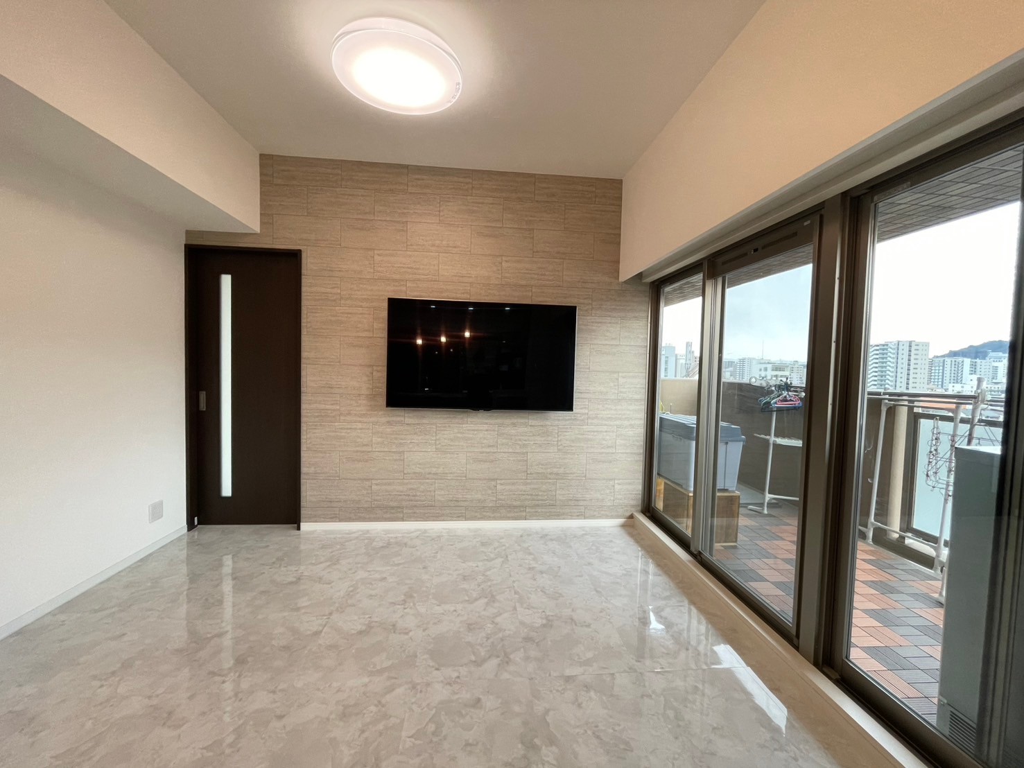壁掛けテレビにできるようにし、アクセントクロスで空間をホテルライクなイメージに近づけました。
