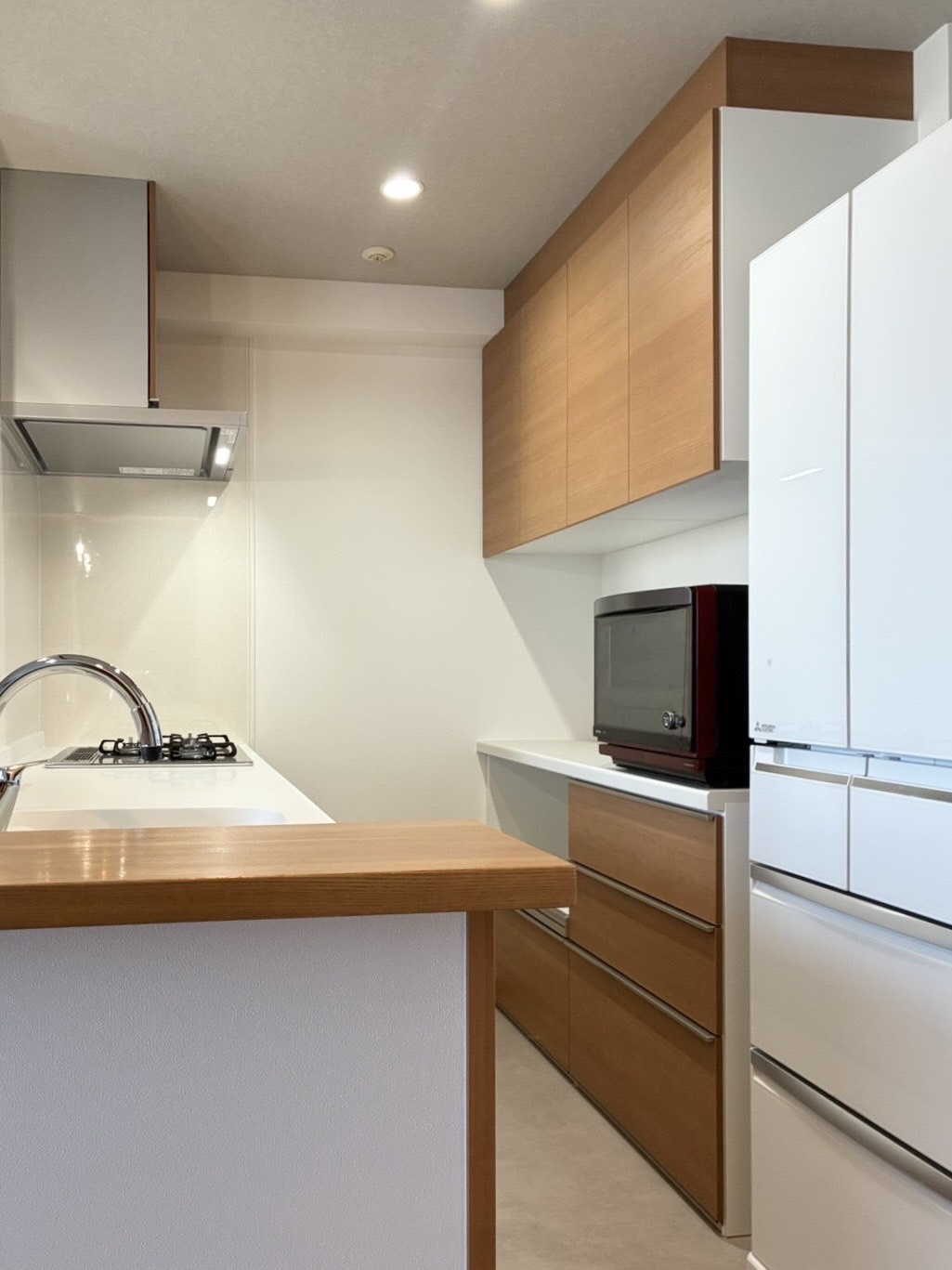 キッチン本体のみではなく空間全体のリフォームをご希望でしたので、キッチンと内装材の色味のバランス・使い勝手を重視し、細かく打ち合わせを重ねながらご提案いたしました。