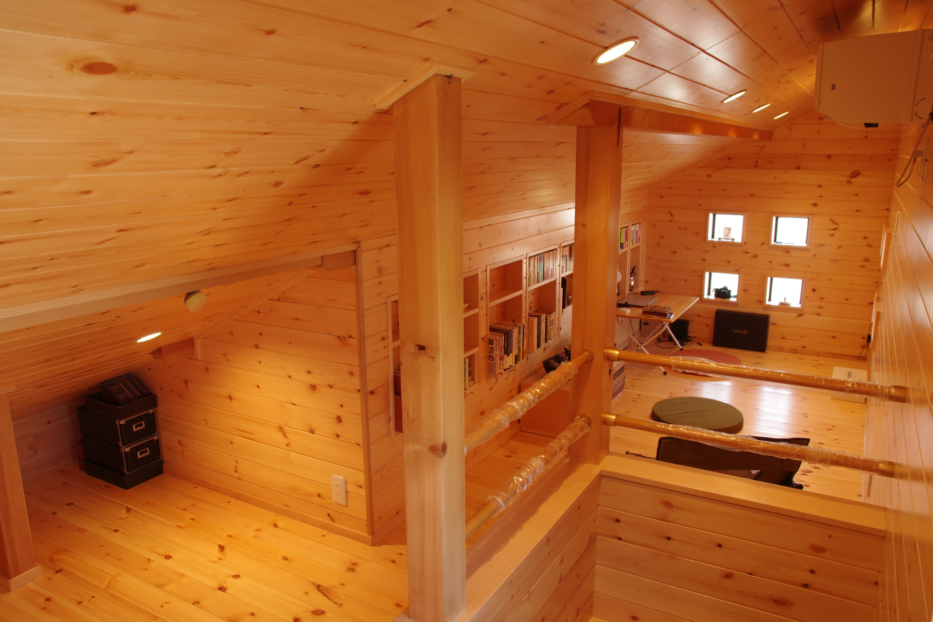 省スペースで小屋裏へ上り下りできるように互い違い階段を設けました。 また、断熱効果を高める為、室内全体にウレタン吹付断熱を施工。 仕上材は全て無垢の杉板で仕上げました。