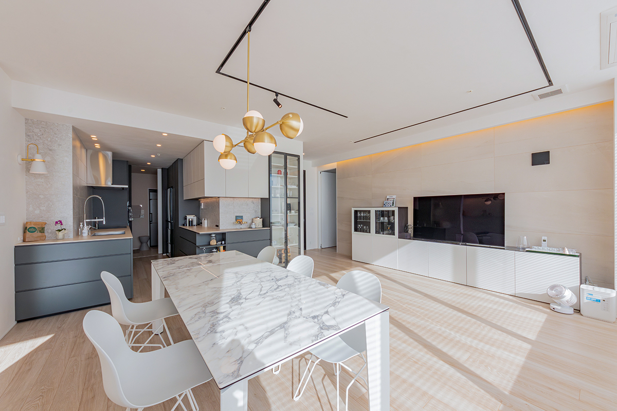 壁付のキッチンにすることで少しでもLDKを広くとり、縦長のLDKでは最高も多く取れ角部屋の良さも存分に引き出しています。 造作のカップボードやベンチ・洗面や室内窓など、多くの造作を取り入れ、購入の家具では補えないぴったりのサイズ感やお好みの雰囲気を存分に取り入れました。 玄関や土間の収納にもこだわって検討したので収納も多くとており、玄関から入るとこだわりのルーバーの扉が目に入り、他の空間の期待も高めてくれています。 寝室やクローゼット〜洗面への動線は回遊動線を取り入れたことで、様々な生活シーンが生まれる住まいとなりました。