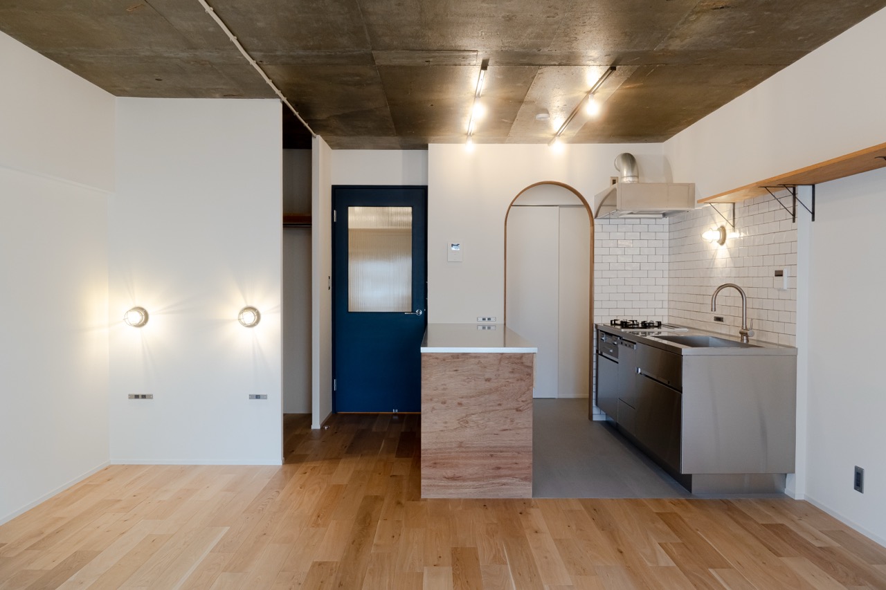 もともと間仕切られていたキッチンをLDKに取り込むことで、視覚的にも広がりのある空間にすることができました。 さらに、キッチンと同じサイズの造作調理台を設けることにより、魚を捌くのに十分な作業スペースを確保しました。 また、55㎡という限られた空間の中でもキッチン・パントリー・脱衣室をぐるっと回れる回遊動線にしたことで、毎日の動きもスムーズです。 寝室はあえて個室にせず、LDKの一角に設けてカーテンで間仕切るスタイルに。 普段は開けて広々と、来客時はさっと仕切ってプライバシーを確保できる、柔軟な空間づくりを実現しました。 玄関からすぐの廊下には造作洗面台を配置。 埋め込み型のボウルで掃除がしやすく、正面には女性に嬉しいコスメやスキンケア用品が置ける棚も設け機能性も◎。 壁に埋め込みの棚にすることで見た目もスッキリとできました。 帰宅後すぐに手が洗える動線も嬉しいポイントです。 内装は釣りが趣味の施主様に合わせて“海”をテーマにコーディネート。 青いリビングドア、白いタイル、マリンランプが爽やかな空気感を演出しています。