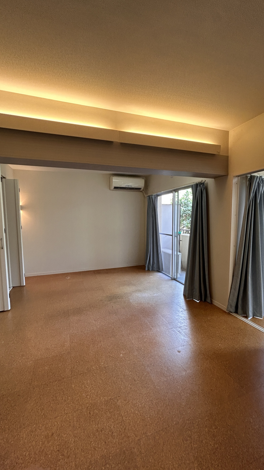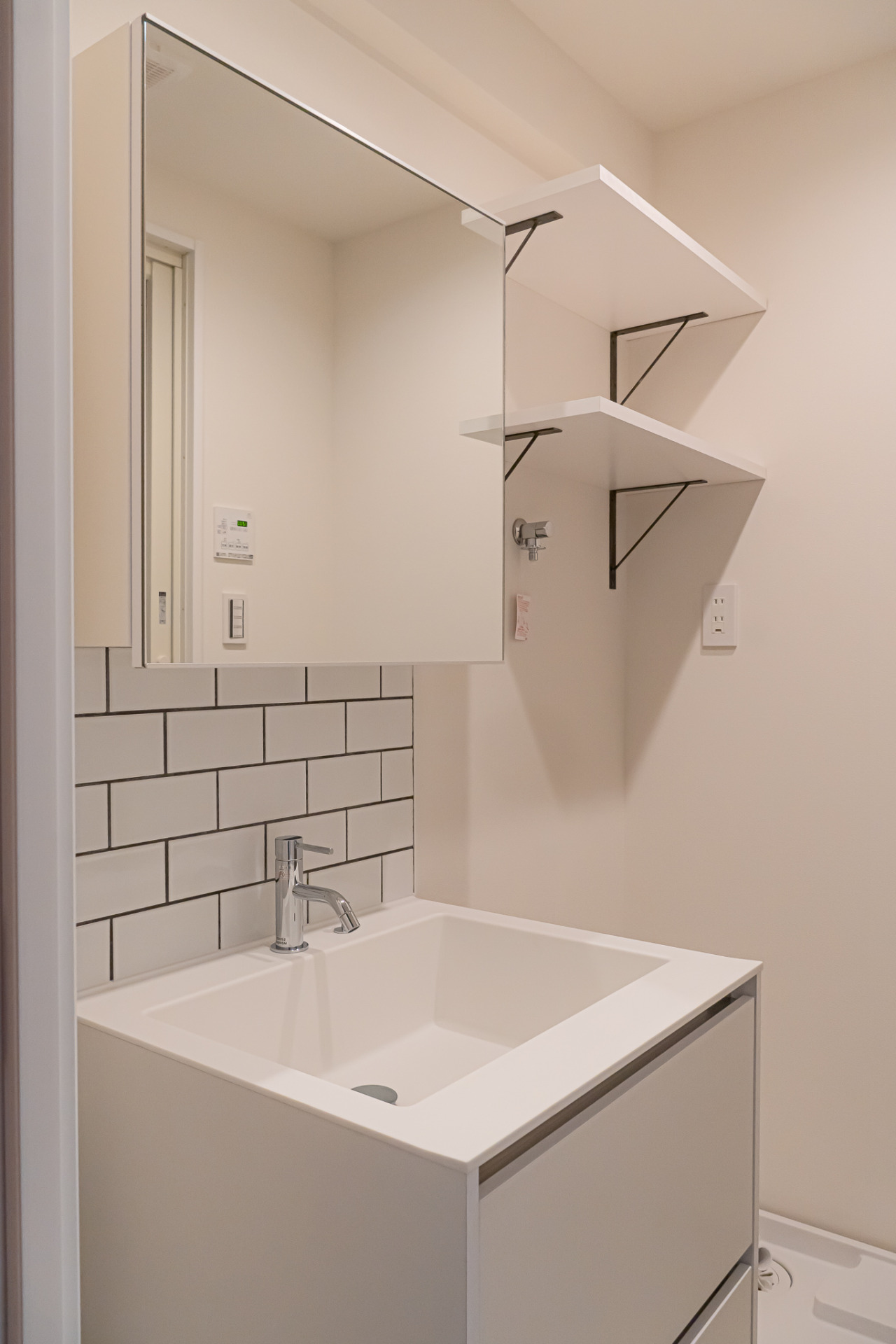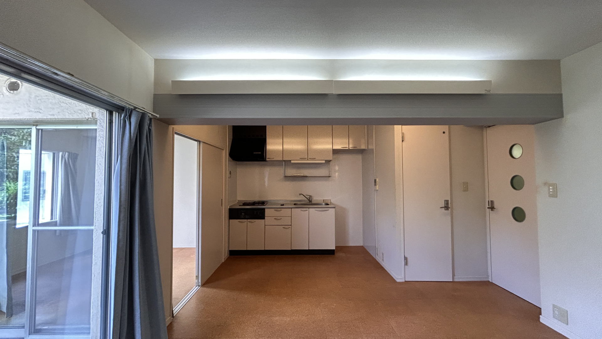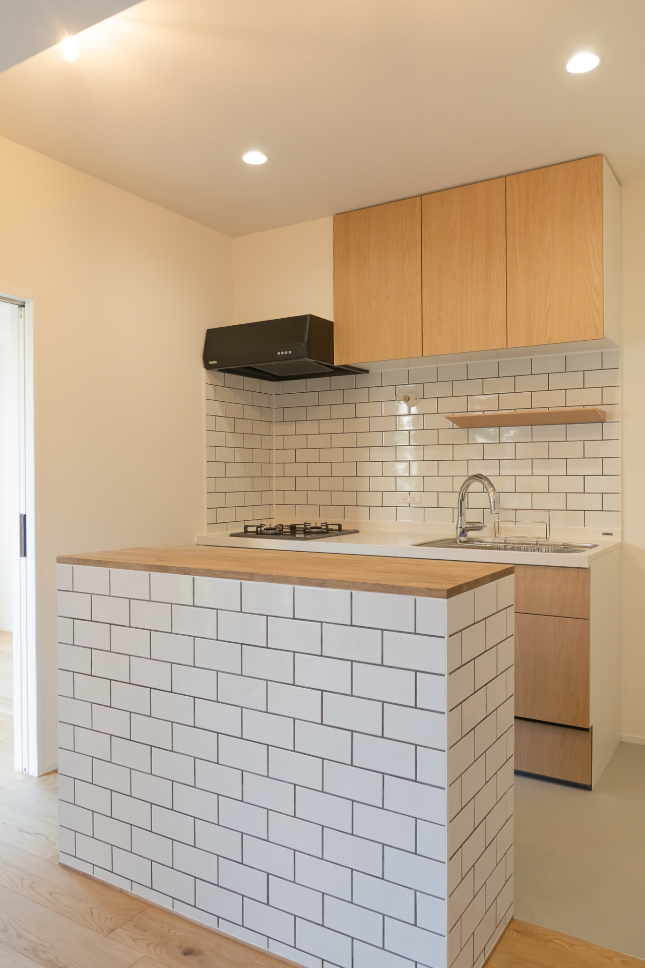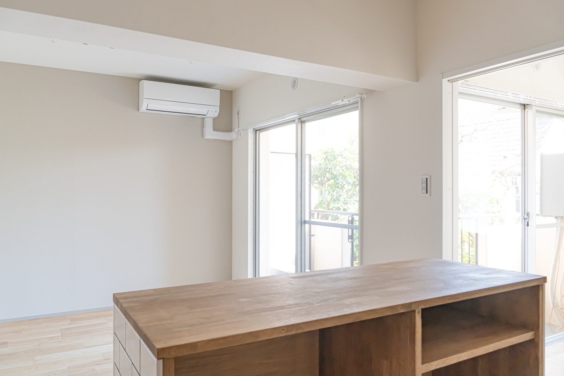 ・少し変わった形のお部屋で水回りの位置はほぼ変えませんでしたが、様々なプランからこちらになりました。 ・対面のキッチンを実現するには少し寸法が足りないため、造作のカウンターを設置して家事動線のしやすい空間に。 ・中庭のようなベランダのあるお部屋で、LDKや寝室にも光がたくさん入ります。
