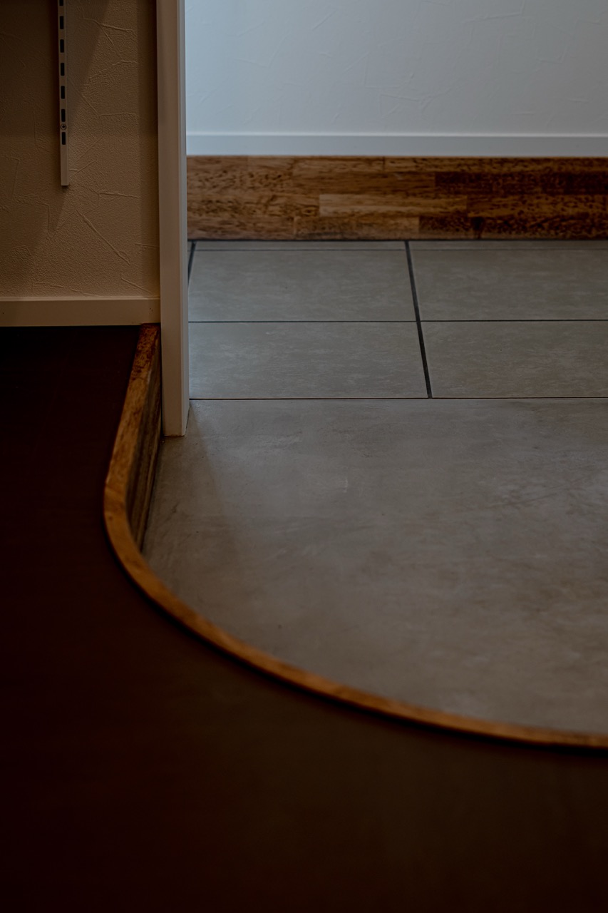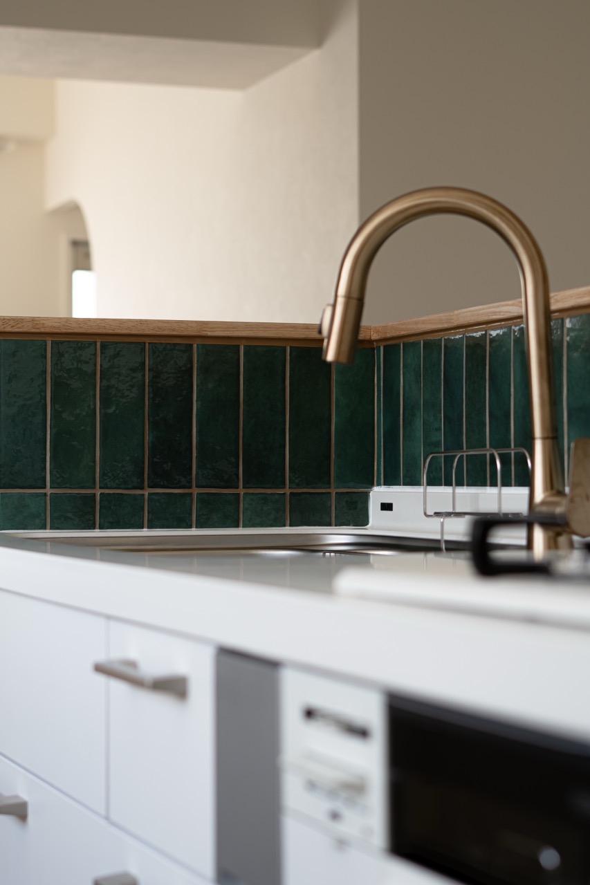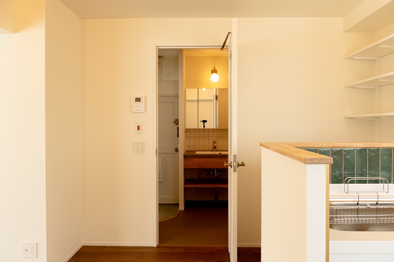 LDK・洗面エリア・ベッドルームの回遊動線を意識し、空間を最大限活用したプランニングになっています。 半アーチ開口やキッチンの床見切りなど、空間の仕切りに緩急をつけることで無駄を省きつつ、狭く感じさせない工夫をしました。 全体的に木と白でまとめ、キッチンタイルを緑にしたり洗面タイルの目地をオレンジにしたりなど、ところどころにアクセントカラーが散りばめられていて、遊び心あるかわいらしい空間に仕上がりました。 床見切りや照明、アクセサリー類が真鍮になっているのも細かなこだわりが詰まっています。 開口や玄関の框がさりげなくアーチにしたことで、曲線が空間を柔らかい印象にしています。 生活動線を考えたプランニングで快適性もありながらデザイン性もある、おうち時間が楽しくなるこだわりの住まいが生まれました。