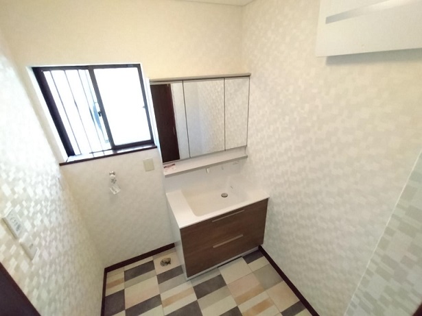 クロス・床クッションフロアを貼り換え、デザイン性のある可愛らしい洗面所になりました。