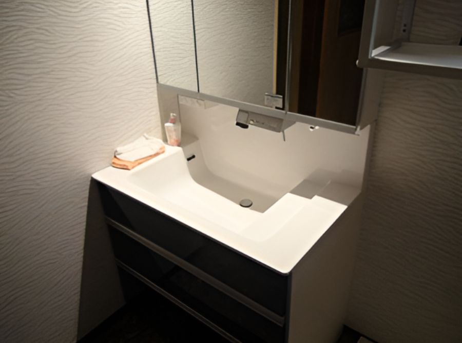 洗面化粧台は、オート手洗い機能付で手をかざすと水が出てきます。