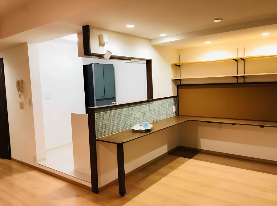 L字型にカウンターテーブルと棚を設置しました。