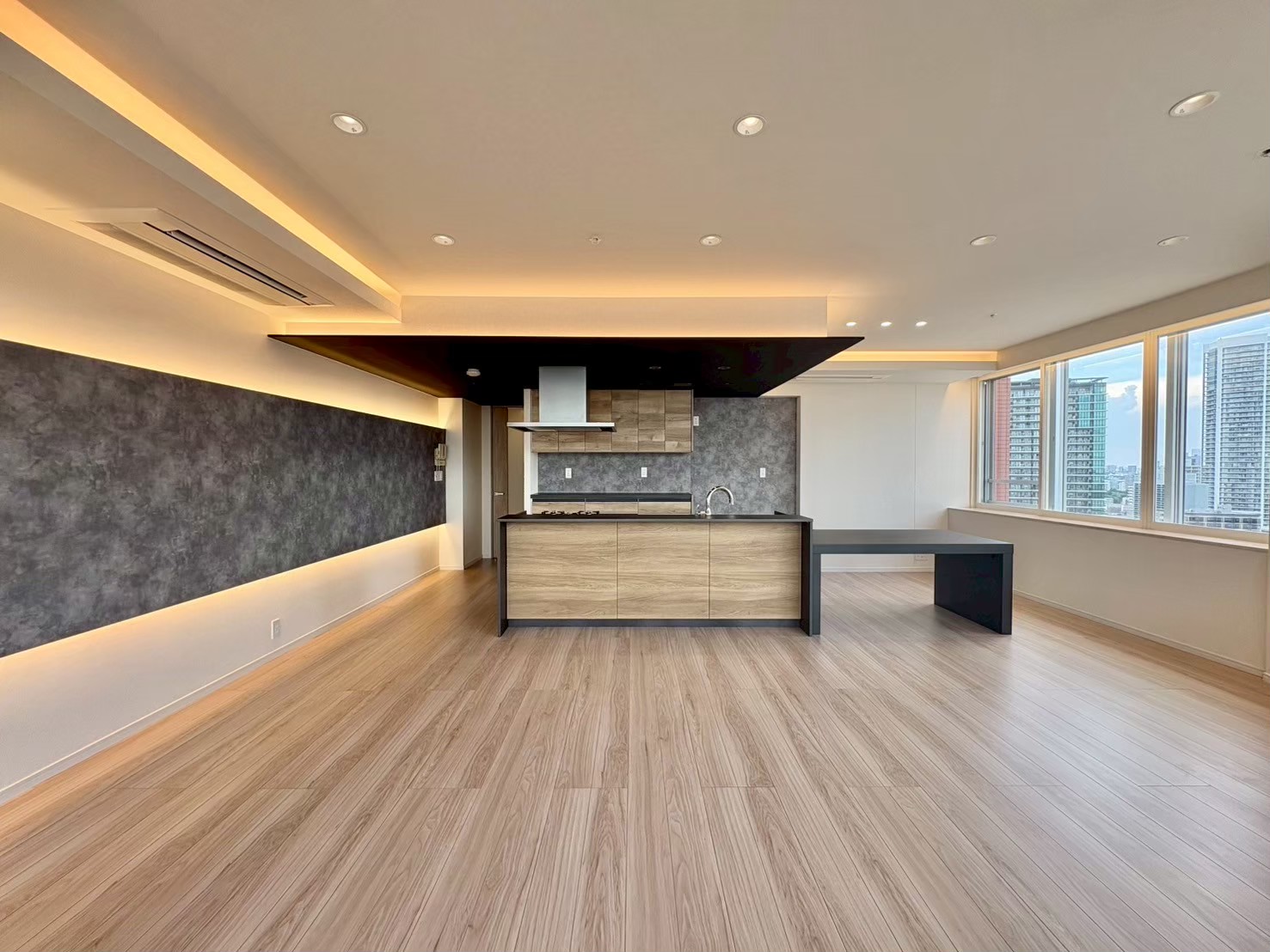 室内が明るくなりすぎると夜景がきれいに見えないので間接照明をLDKには多く配置いたしました。 壁掛けTV部分も壁が飛び出しているようなデザインでおしゃれに造作をしました 玄関・廊下・トイレ・洗面の床は磁器タイルを使用して高級感を出しています。 設備の仕様の相談を繰り返し、ご要望のをできるだけ叶えた設備を中級グレードでまとめました。