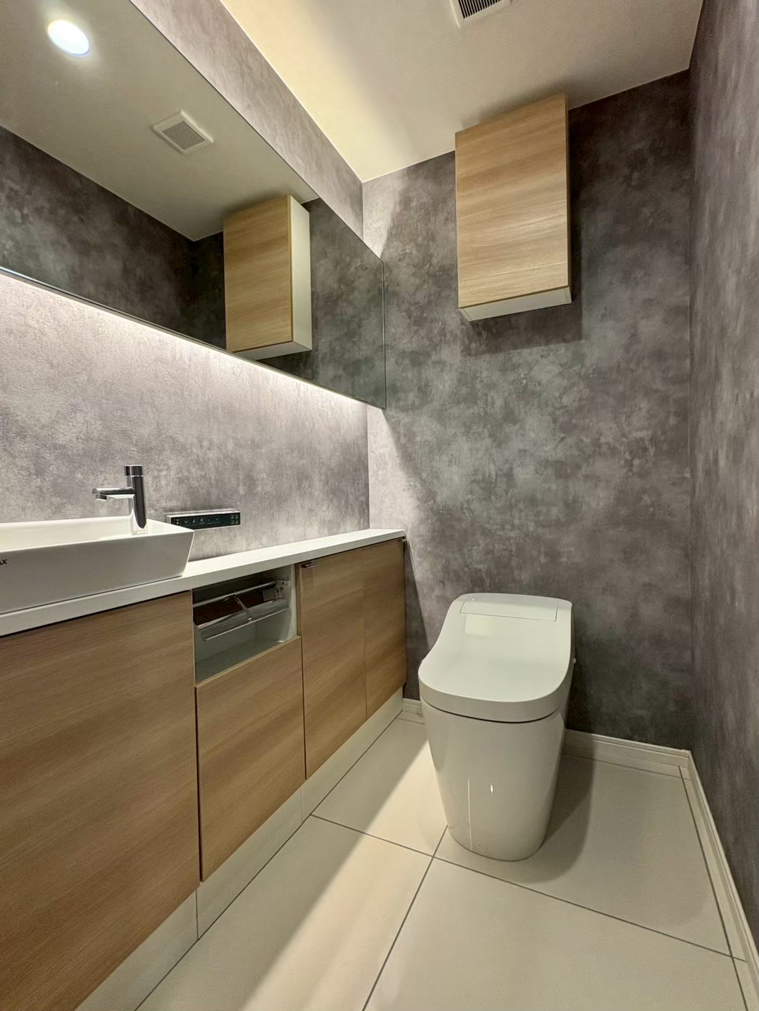 ワイドミラーを設置して鏡の上下に間接照明を設置しました。おしゃれで明るい空間を実現しています