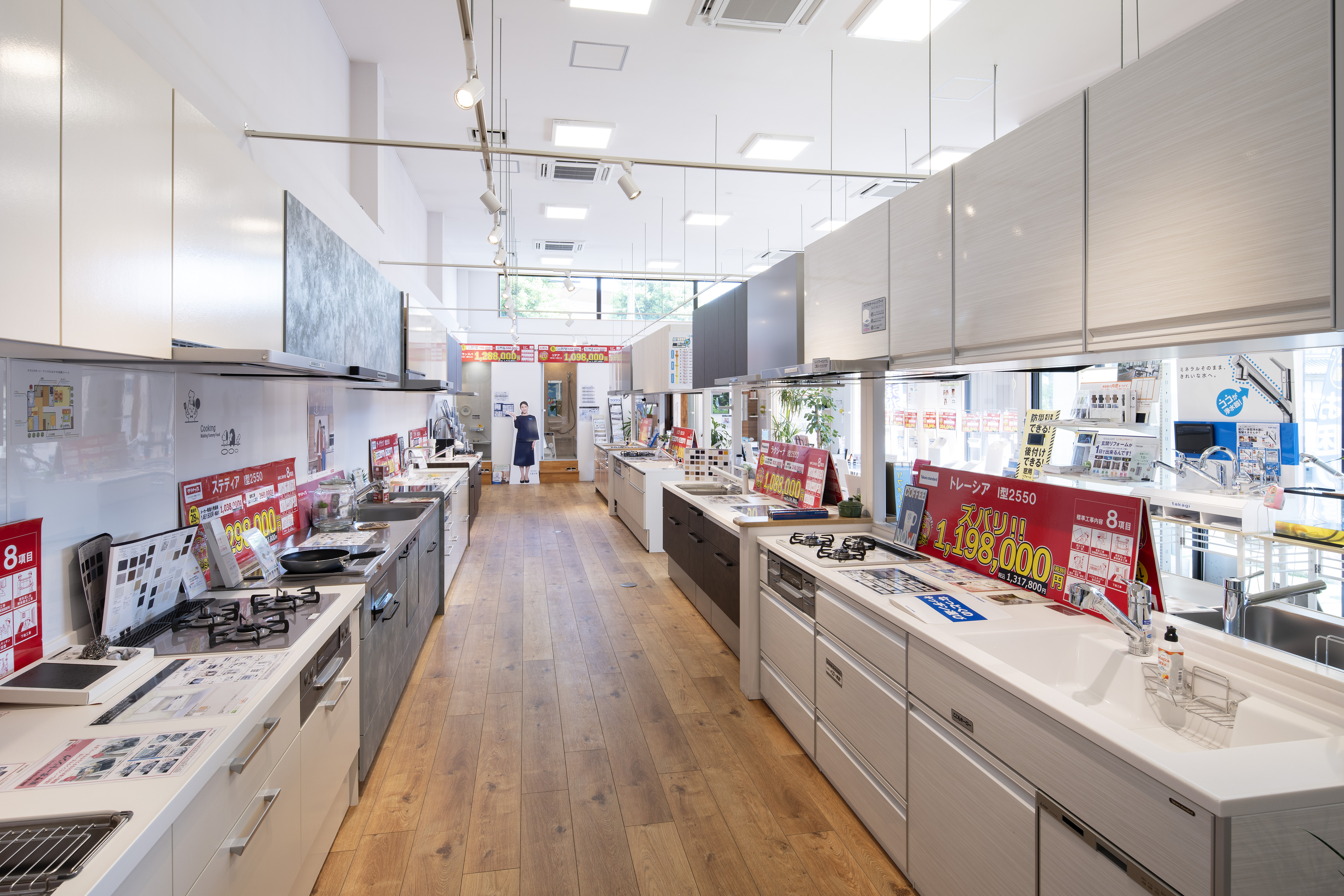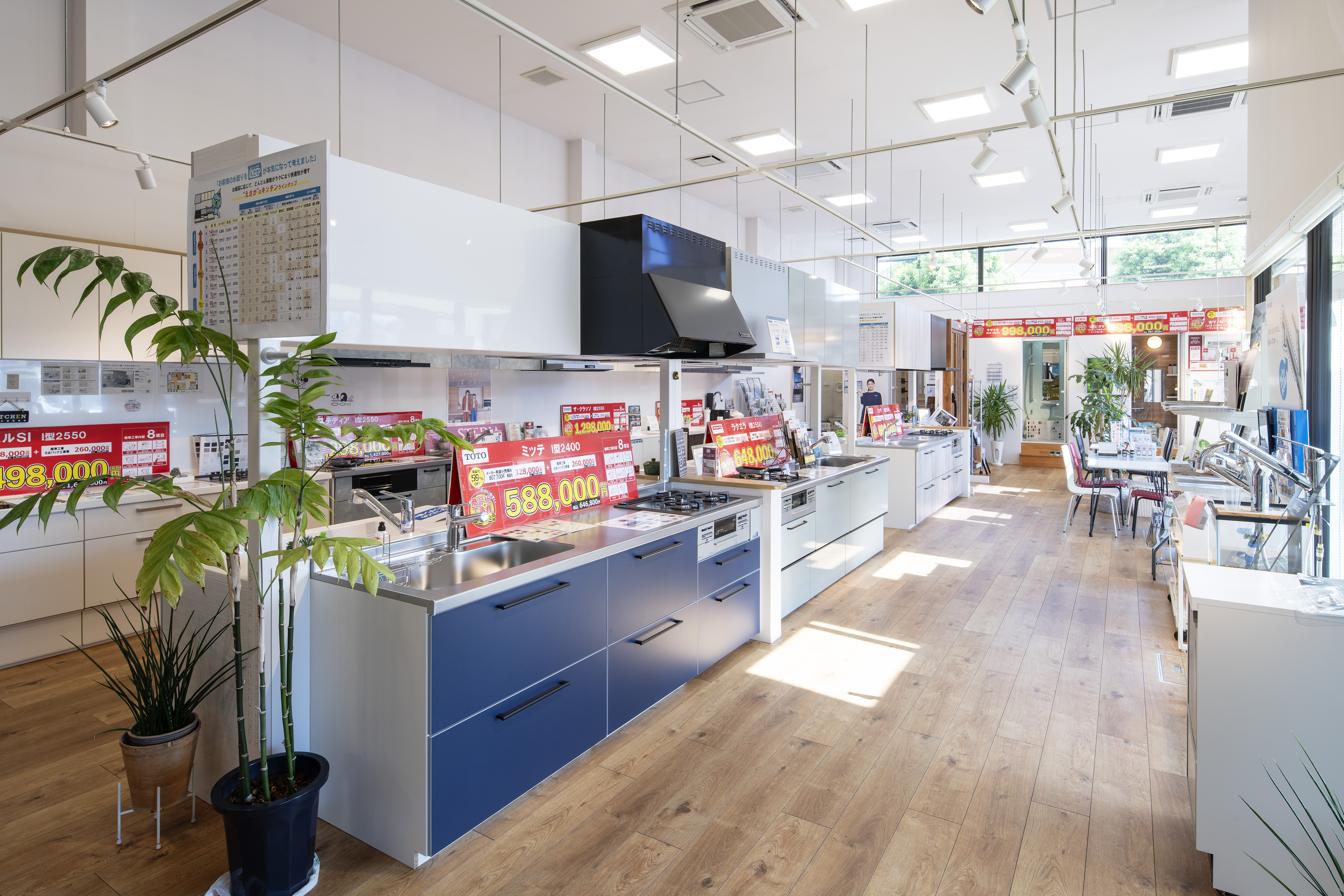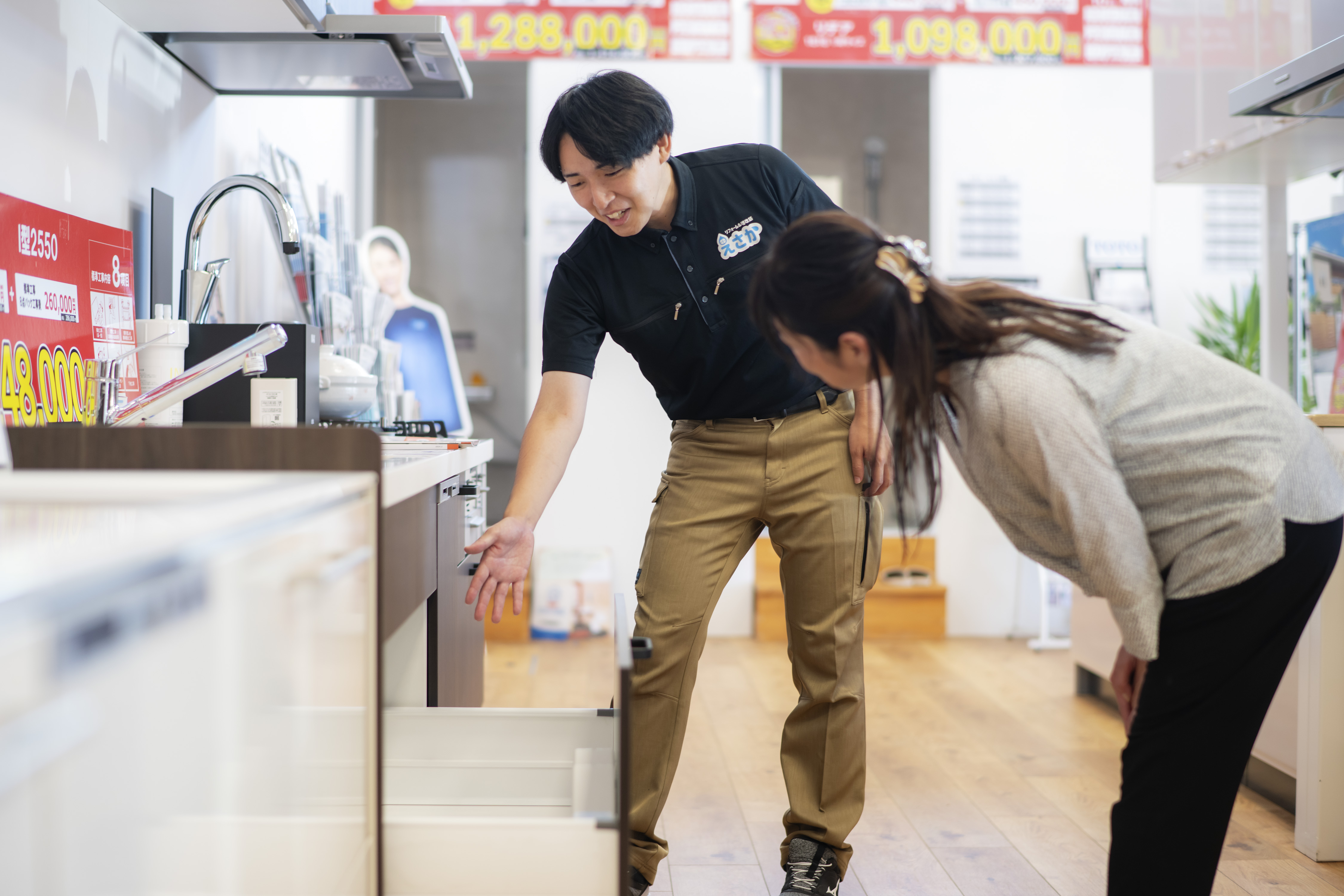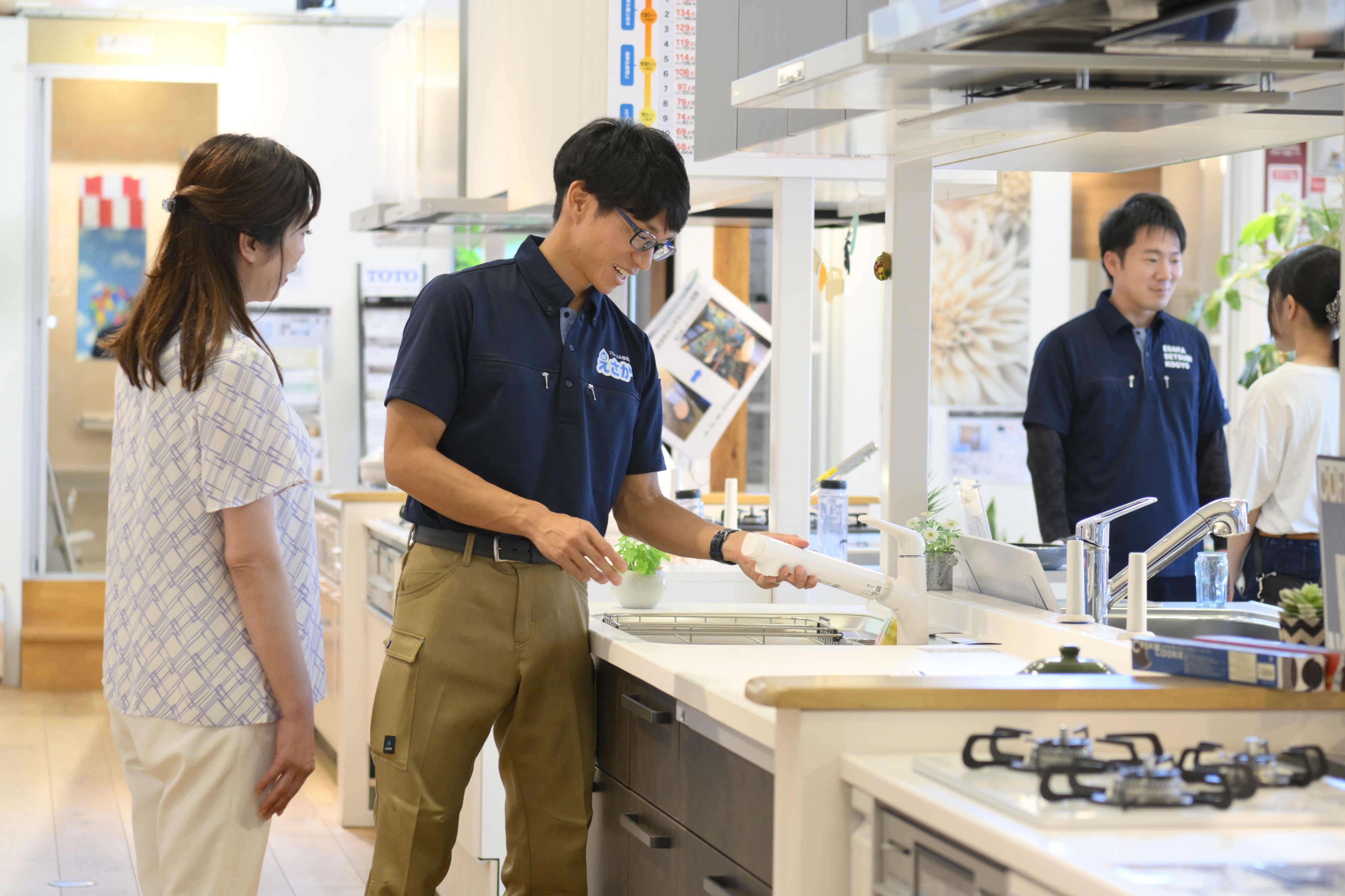 えさかショールームでは、キッチン、バス、トイレ、洗面台など、住宅の主要な設備を実物展示しています。複数メーカーの商品を一度に見比べられるため、お客様のニーズに最適な製品を選びやすい環境を提供しています。