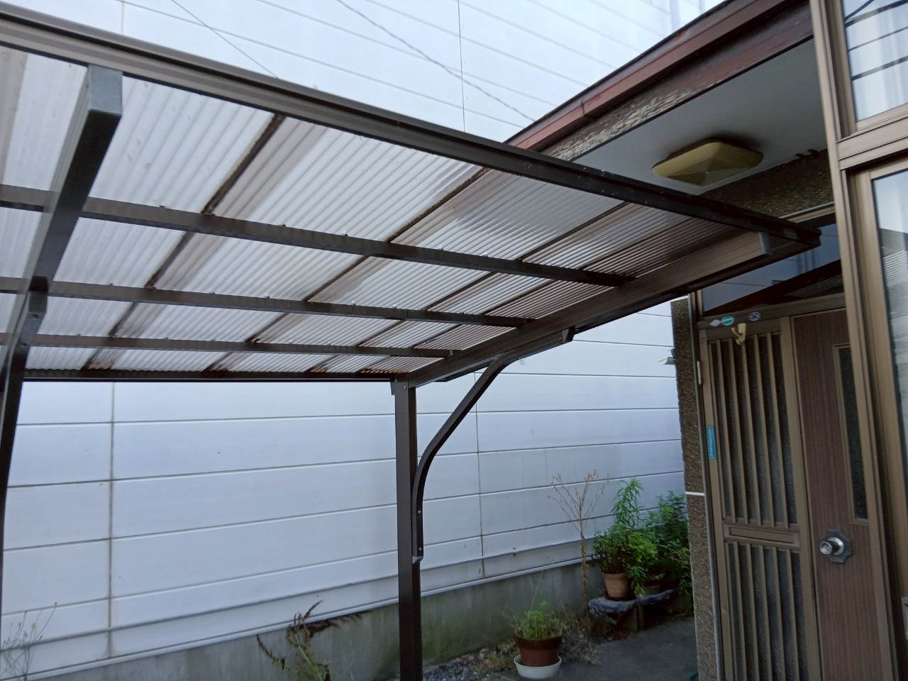 新しい波板は透明感があり、以前よりも採光性が向上したことで、駐車スペースや玄関周りが明るくなりました。さらに強度が増したことで「これで強風の日も安心できます」とお客様にもご満足いただきました。