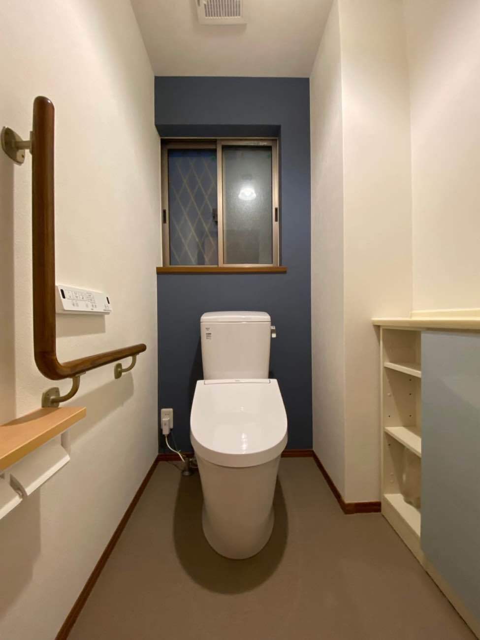 既存の手洗い器と同系色のブルーのアクセントクロスが目を引くトイレに仕上がりました。トイレ本体はLIXILのアメージュ便器になります。