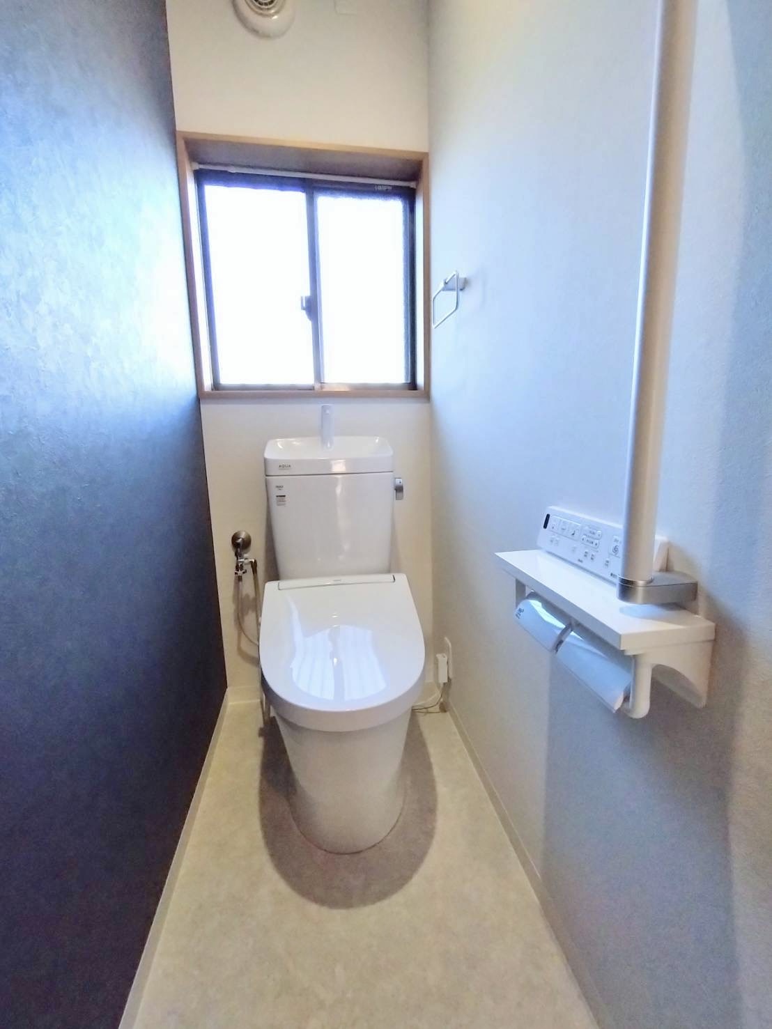 既存の手洗い器と同系色のブルーのアクセントクロスが目を引くトイレに仕上がりました。トイレ本体はLIXILのアメージュ便器になります。