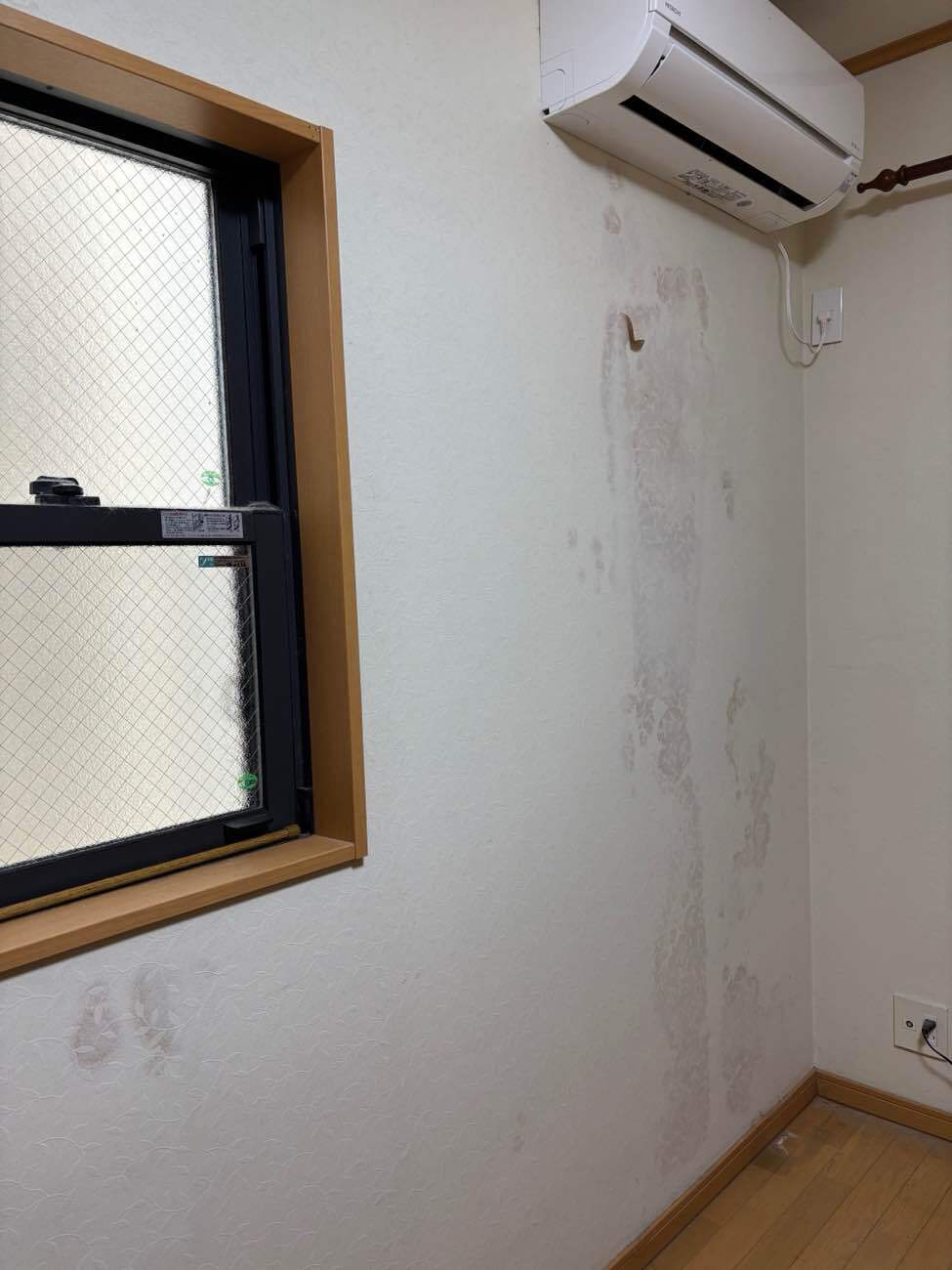 エアコン配管周りから雨が伝い、雨漏りが起きていました。長期で家を空けていたことでカビが大量発生し、黒ずんでしまいました。