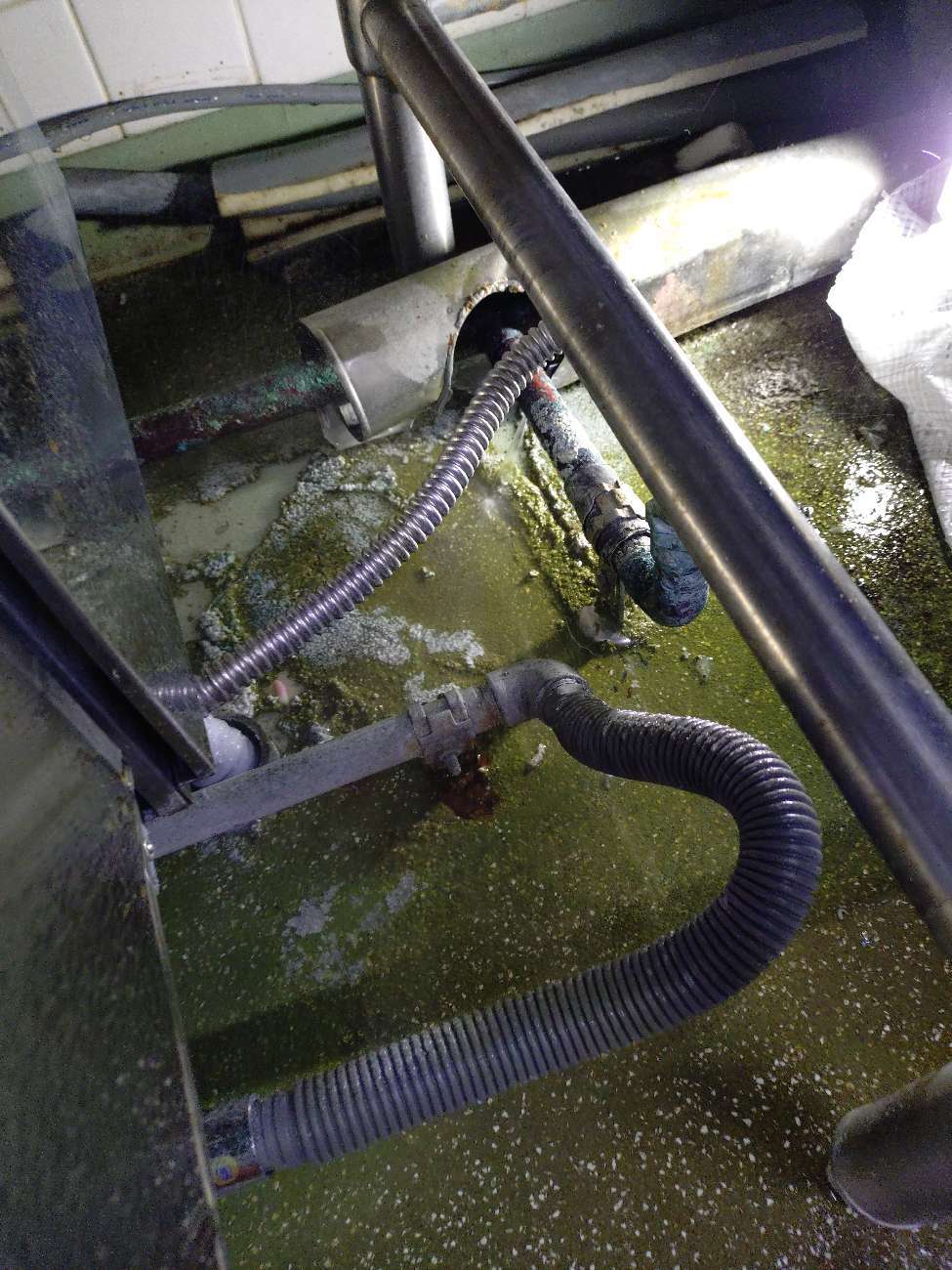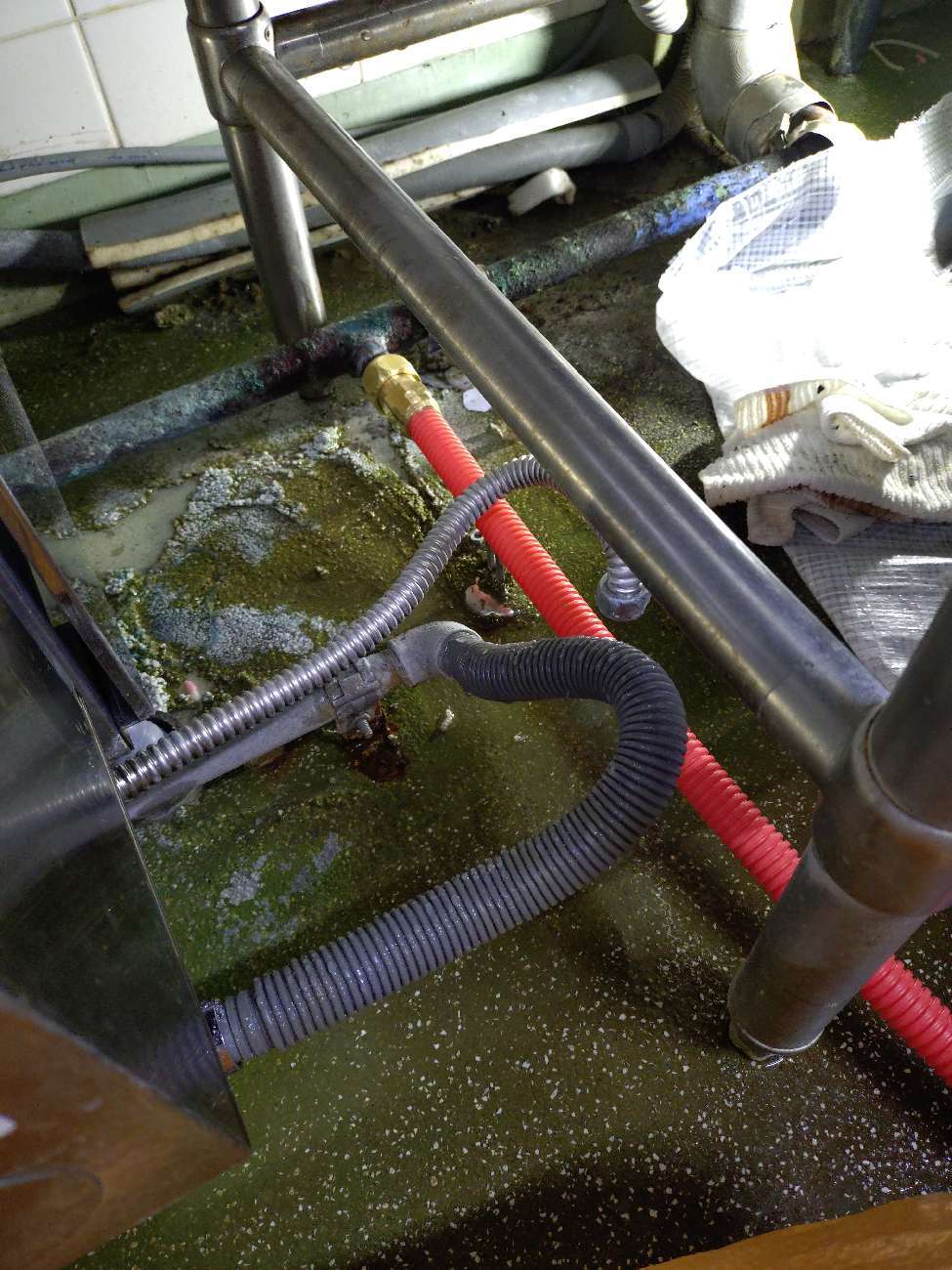 水漏れの原因は、銅製の「銅管」に発生した錆によるものでした。厨房では日常的に床を水で清掃されるため、長年の使用により配管が腐食し、穴が開いてしまったと考えられます。 該当箇所の配管を切除・交換したところ、接合部からも水漏れが確認されたため、接合部もあわせて交換いたしました。