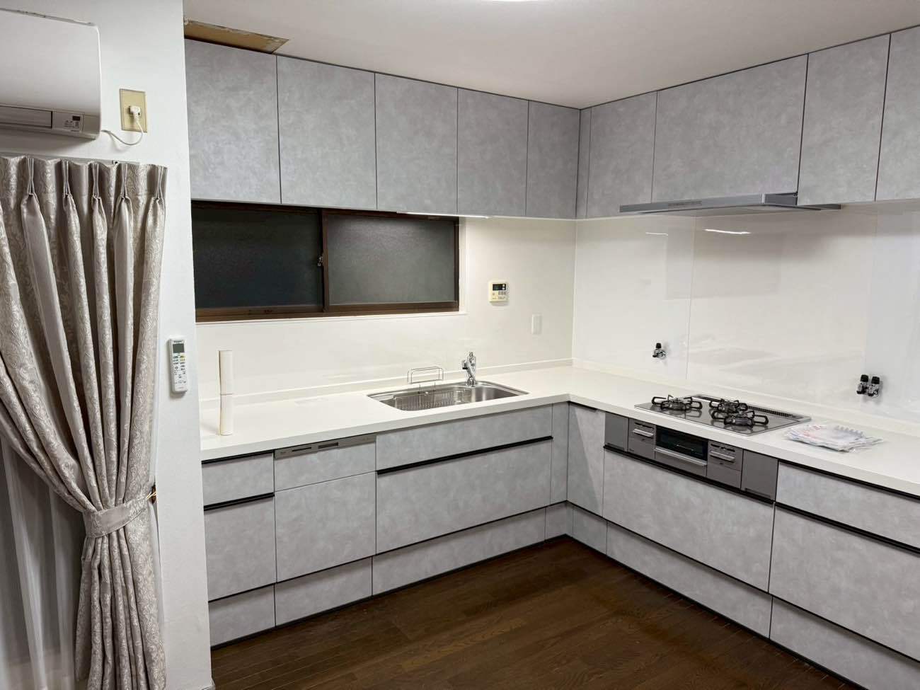 既存のキッチンは左端に乾燥機が付いたL型タイプで、交換後も使い慣れたL型レイアウトを採用しました。 乾燥機をなくすことで、新たなスペースが生まれています。