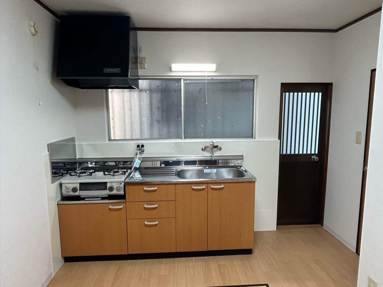 LIXILのセクショナルキッチンGSシリーズを採用し、ガスコンロ・ガスコック・換気扇を交換。タイル壁はキッチンパネルに変更し、照明も新設しました。吊戸棚は設置せず、クロスと床(クッションフロア)も一新しています。