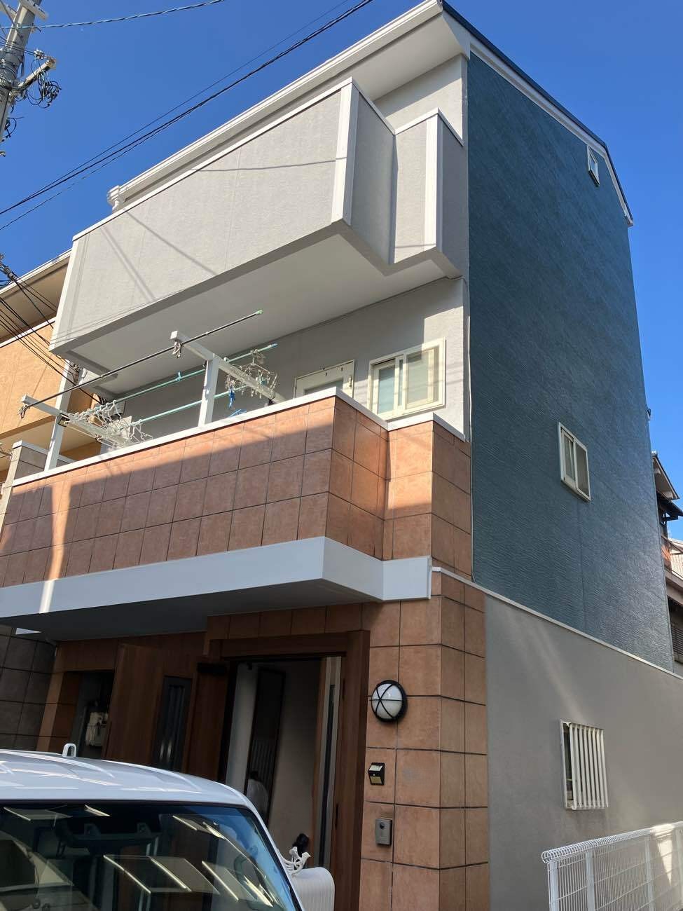 青とグレーのツートンカラーで塗装しました。タイル部分にはクリヤー塗装を施し、目地・サッシ廻りのシーリングや雨樋の補修なども同時に施工しています。 青とグレーの組み合わせが合っていてかわいい外観に仕上がりました。