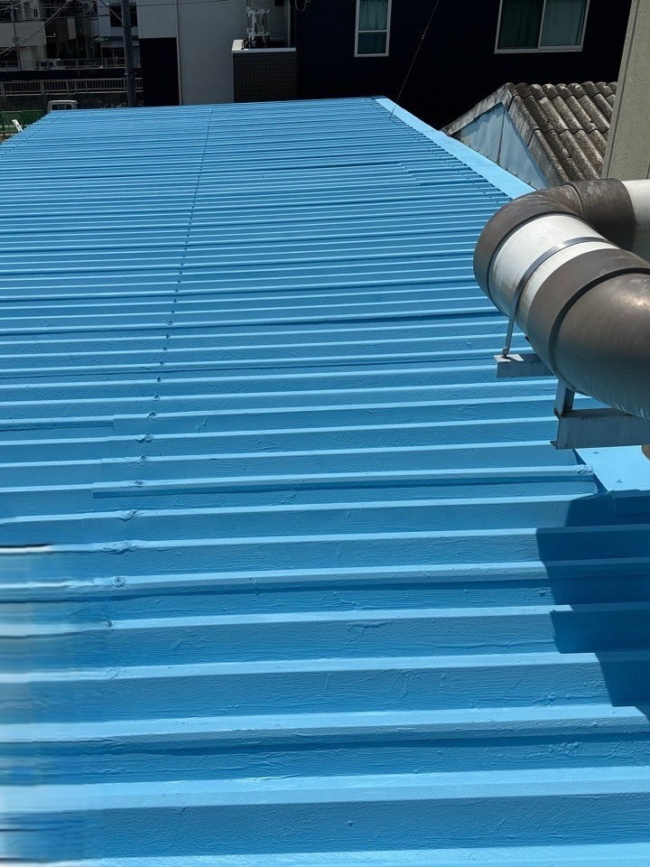 仕上げ塗料の密着性を高めるための、屋根の水洗い(高圧洗浄)や下地づくりを丁寧に行います。 サビの進行を食い止め、長持ちをさせるために錆止めを塗ります。 仕上げでお客様がセレクトされたブルー色で遮熱塗料を塗りました。日射を反射して、屋根が熱くなるのを防ぎます。 この塗料は、塗るだけで室内温度が約5℃前後下がるという実験データもある、信頼性の高い製品です。