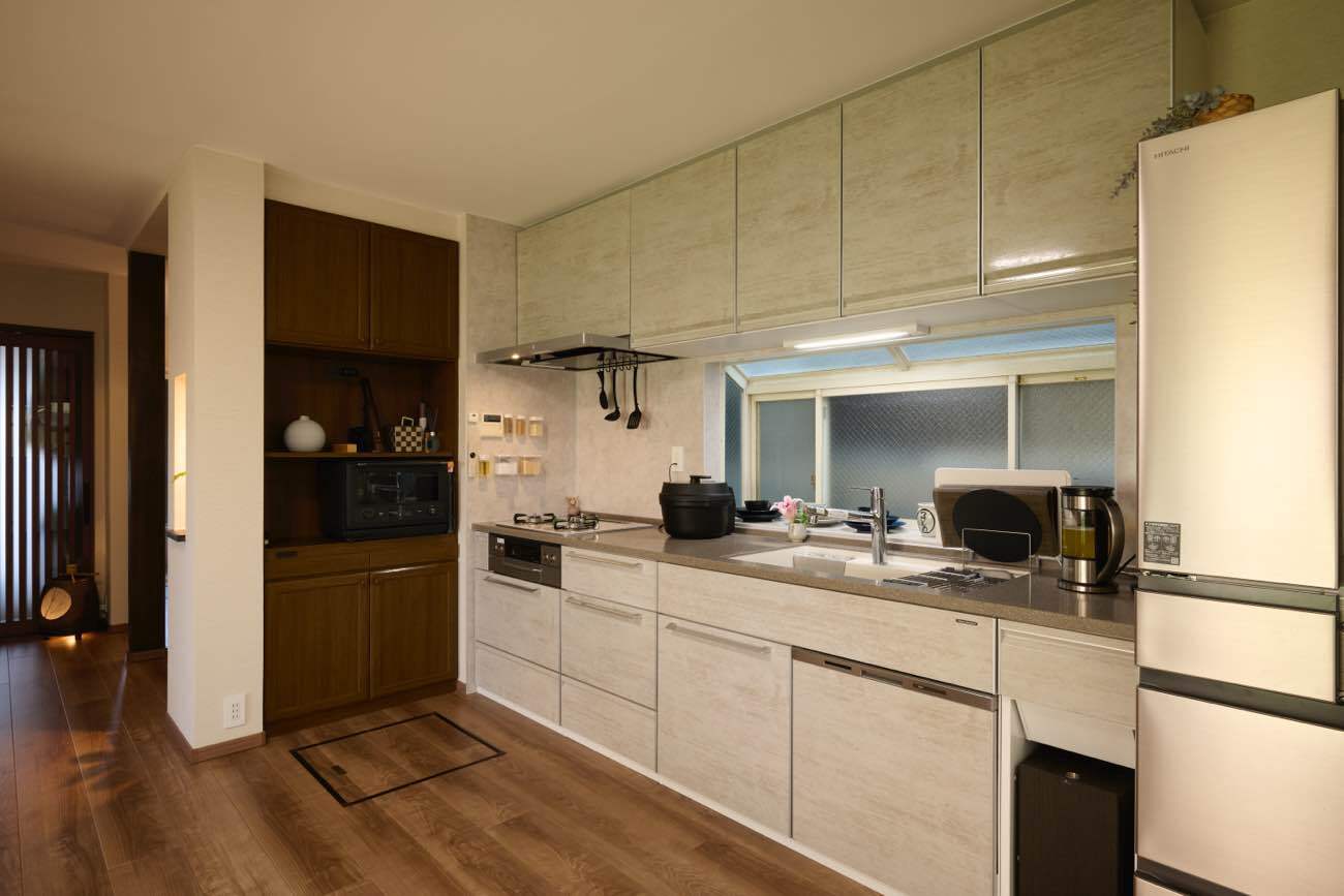 ゆとりあるカウンターを設けることで、収納スペースにも自由度を持たせました。これからのご家族との暮らしに寄り添いながら、柔軟に対応できる、実用性と美しさを兼ね備えました。