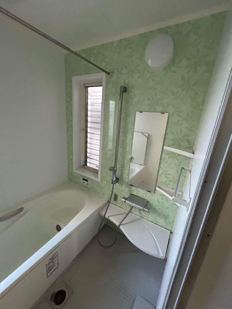 2つあった浴室の窓の1つを塞ぎ、1つは、FIX窓に変更していきます。リフォーム後は鏡をなくし、お掃除の手間を軽減していきました。