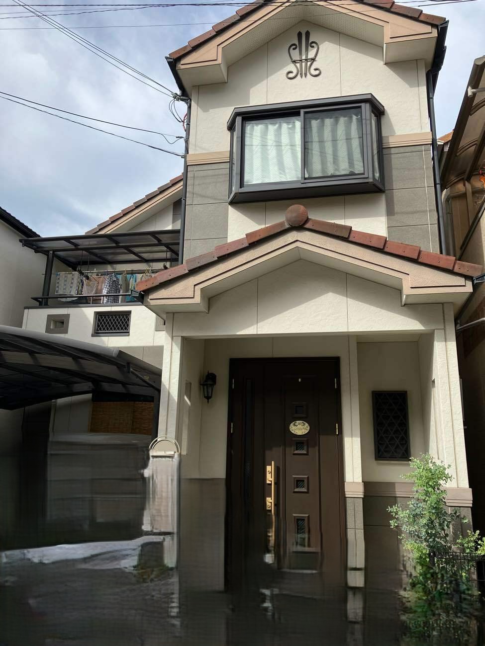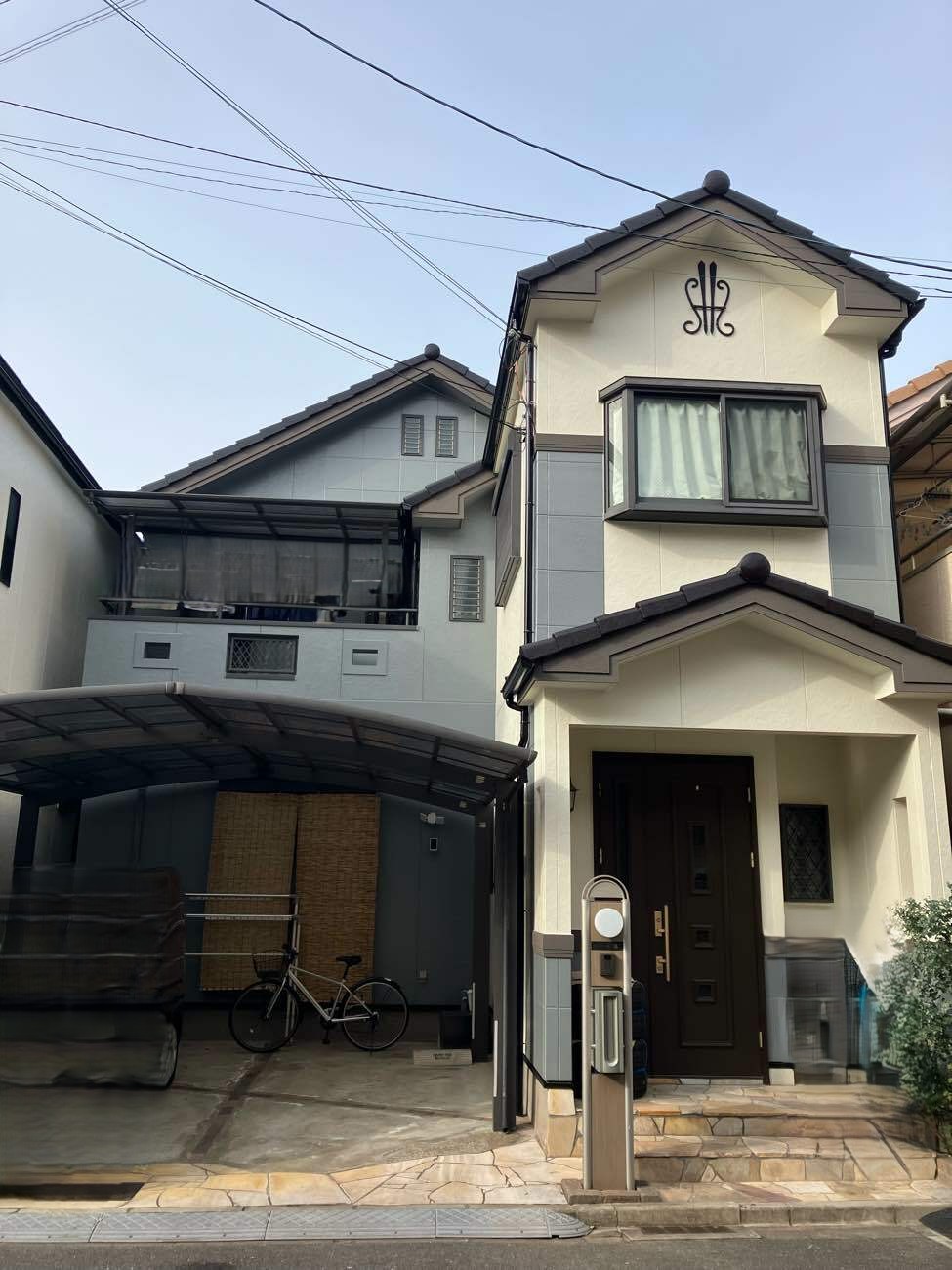 ライトグレーとアイボリーのツートーンで、明るくおしゃれな印象に生まれ変わった外観。壁以外の金属部分も塗りなおして美しくなりました。