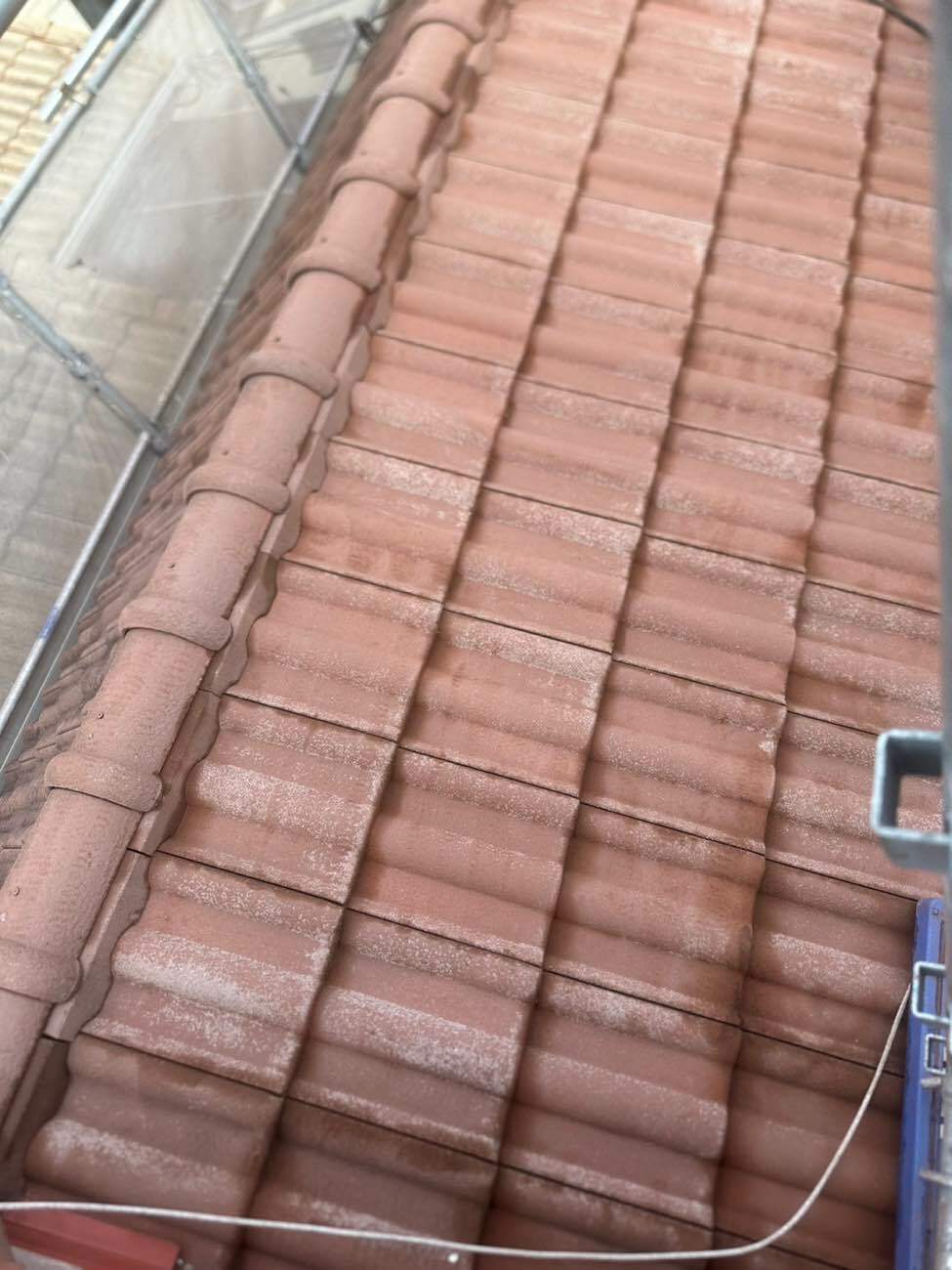 20年を経過した屋根のモニエル瓦は、表面の塗膜が劣化して素地が現れた状態でした。