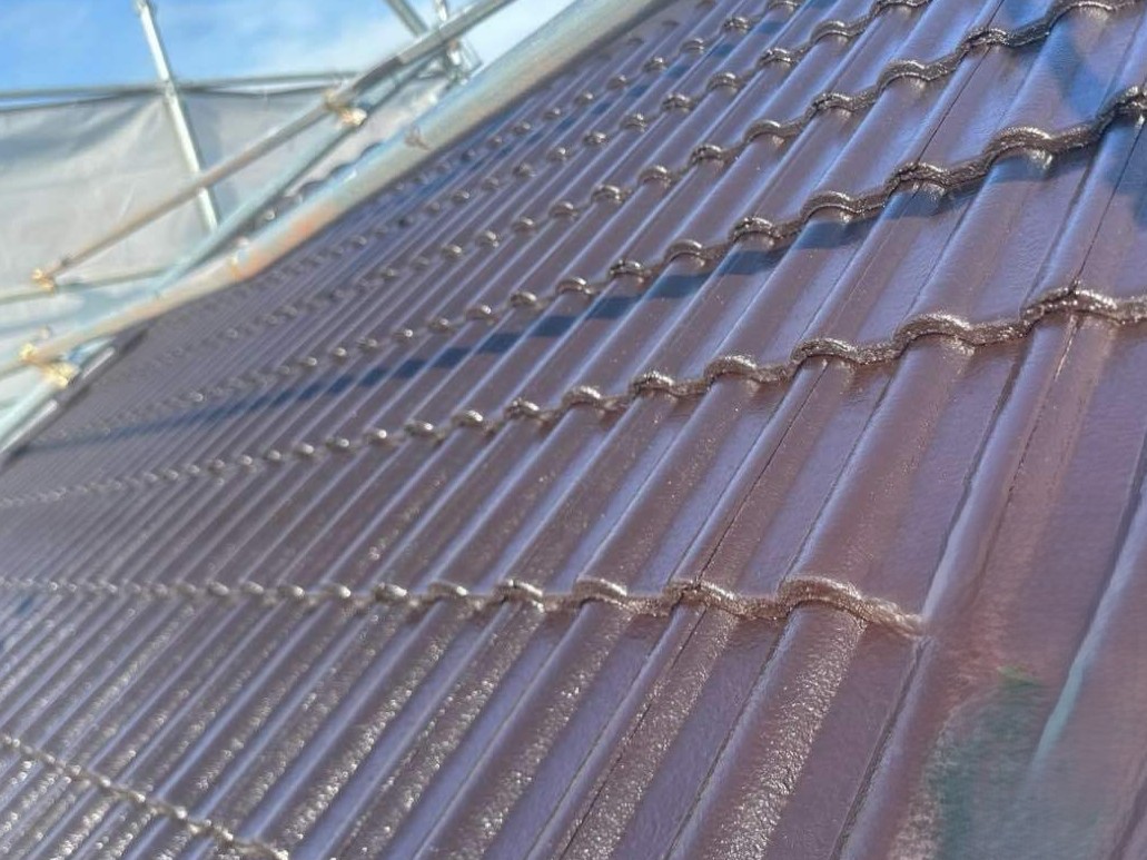高圧洗浄で汚れを取り除いたのち、耐候性、防カビ・防藻性に優れたモニエル瓦専用塗料、オリエンタル塗料工業の「マイティーシリコン」を吹き付け塗装しました。