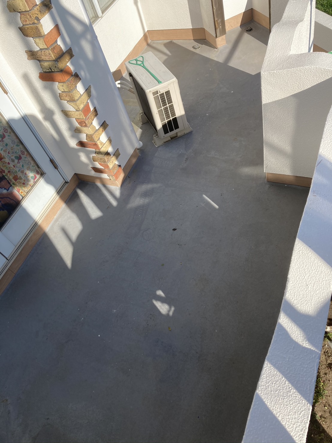 下地処理の徹底 ・下地にゴミやホコリ、油分が残ると密着不良の原因になるため、洗浄・乾燥を丁寧に実施。 細部までの施工精度 ・立ち上がり部分やドレン(排水口)まわりは漏水のリスクが高いため、特に入念に施工。 ・端部の処理は刷毛やローラーを使い分け、均一な厚みを確保しました。 耐久性と美観への配慮 ・紫外線劣化を防ぐため、トップコートを均一に塗布し、美観と防水性を両立しました。 お客様の生活への配慮 ・工事中はできる限り短工期で仕上げ、洗濯やベランダ利用に支障が出ないよう調整。 ・臭いや騒音への配慮を行い、近隣へのご迷惑を最小限に抑えました。