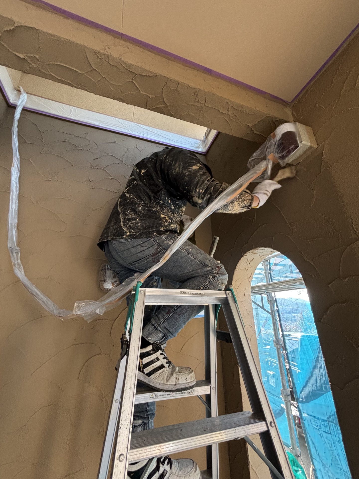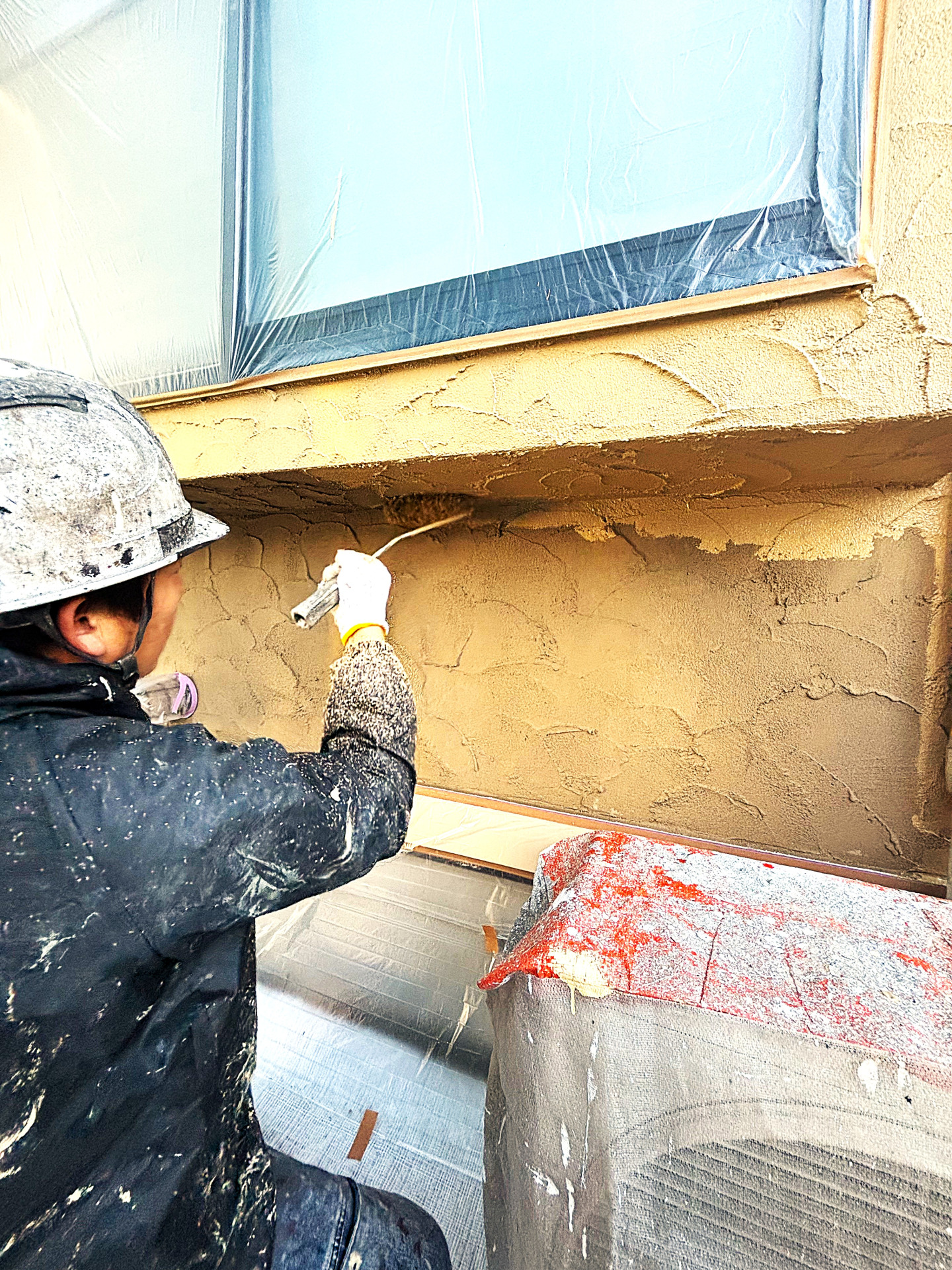 ジョリパットフレッシュの施工中写真 細かい箇所まで丁寧に塗装しています。