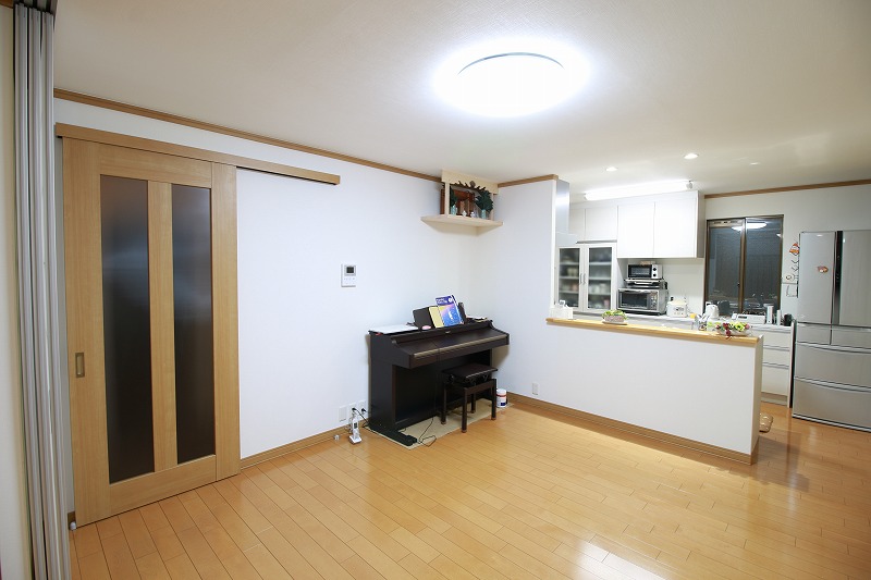 和室とリビングの壁をなくしつながりのある大空間へ。家族が大勢集まってもゆったりと過ごすことができます。また、独立した和室としても使えるように、光を通す間仕切りの扉を付けました。押入れはクローゼット収納に変えることで、洋服やお客様のコートなども仕舞えるようになりました。