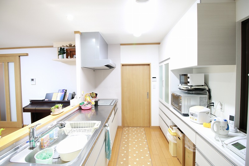 キッチンの扉の向こうは洗面所につながっています。お料理しながら洗濯もできるので効率的に家事ができます。「キッチンの高さもちょうど良く、食洗機のおかげで家事時間も減りました」と奥様は喜んでいらっしゃいます。