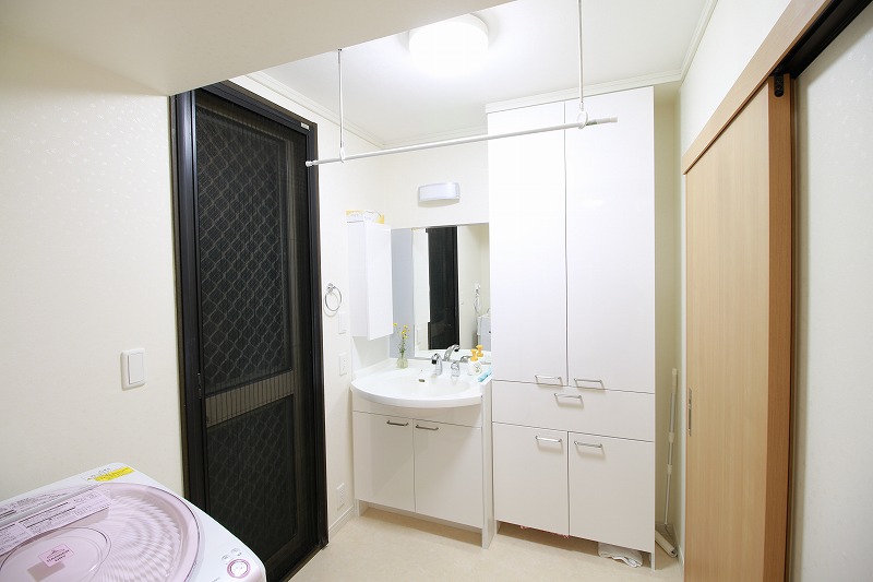 間取りを変更することで十分な広さの洗面所になりました。収納は下着やタオルをまとめてしまえる大容量。洗濯機横の物干しは、洗う→干すの家事負担を最小限にしてくれます。