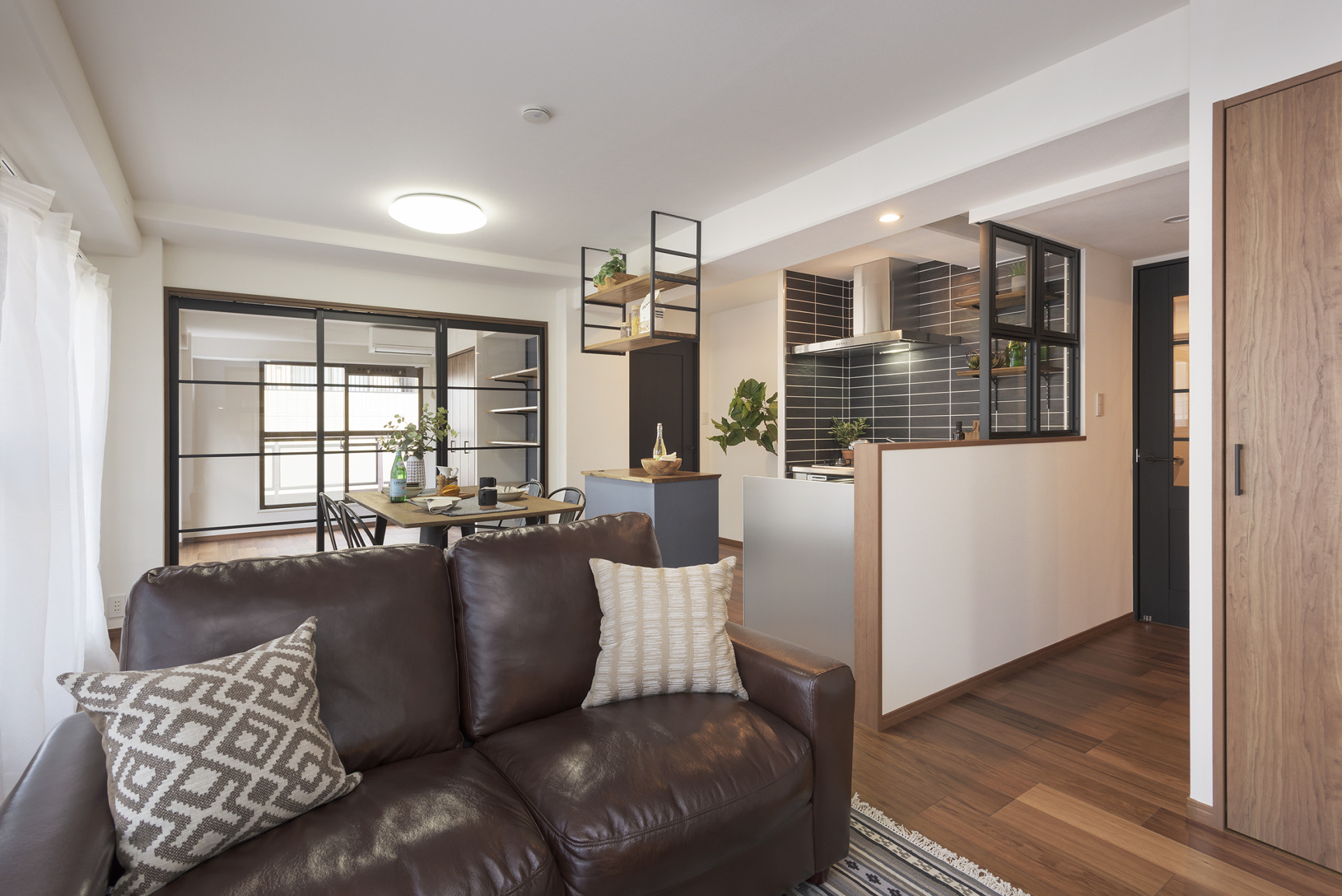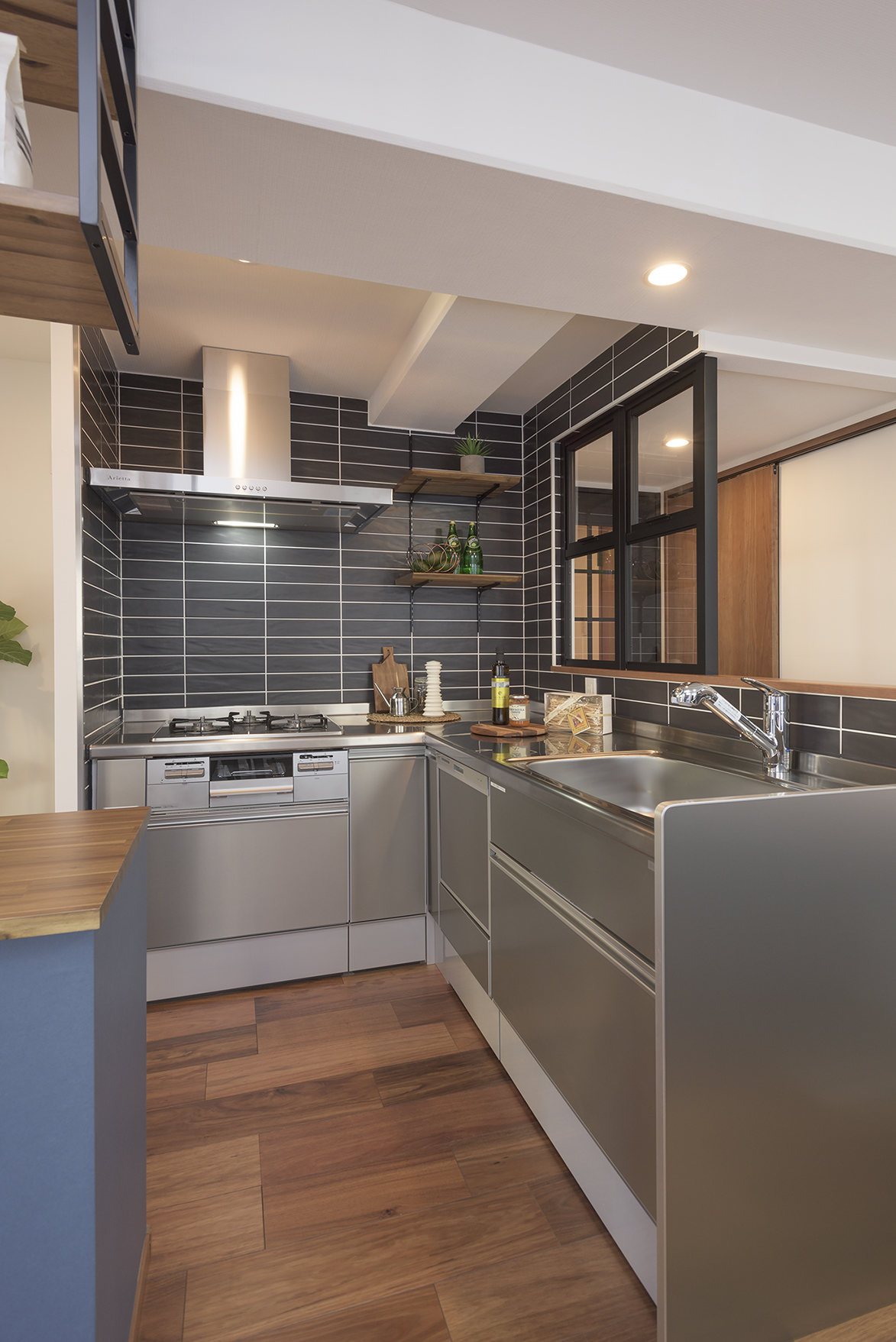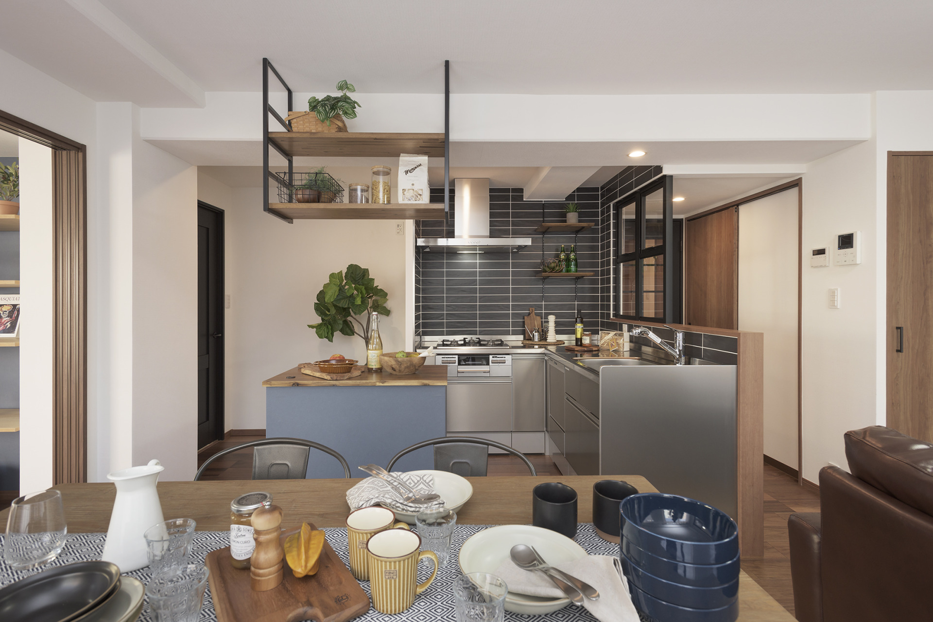 リビングダイニングを拡張してスペースの確保を行った上で、キッチンの向きを変更することで、動線の解消と解放感の確保ができるご提案を行いました。 リビングダイニングの中心に設置したキッチンが、各部屋への動線をつなぐ『ハブ』の役割を果たしています。 キッチンにはステンレスとブラックタイルを採用し、解放感溢れる雰囲気にぴったりなカフェ風に仕上げました。 また、居室との間に室内窓を設けることで、光を取り入れると共に隣の部屋とのつながりを高めています。 どこにいても家族を感じられる、ハートフルなリノベーション事例です。