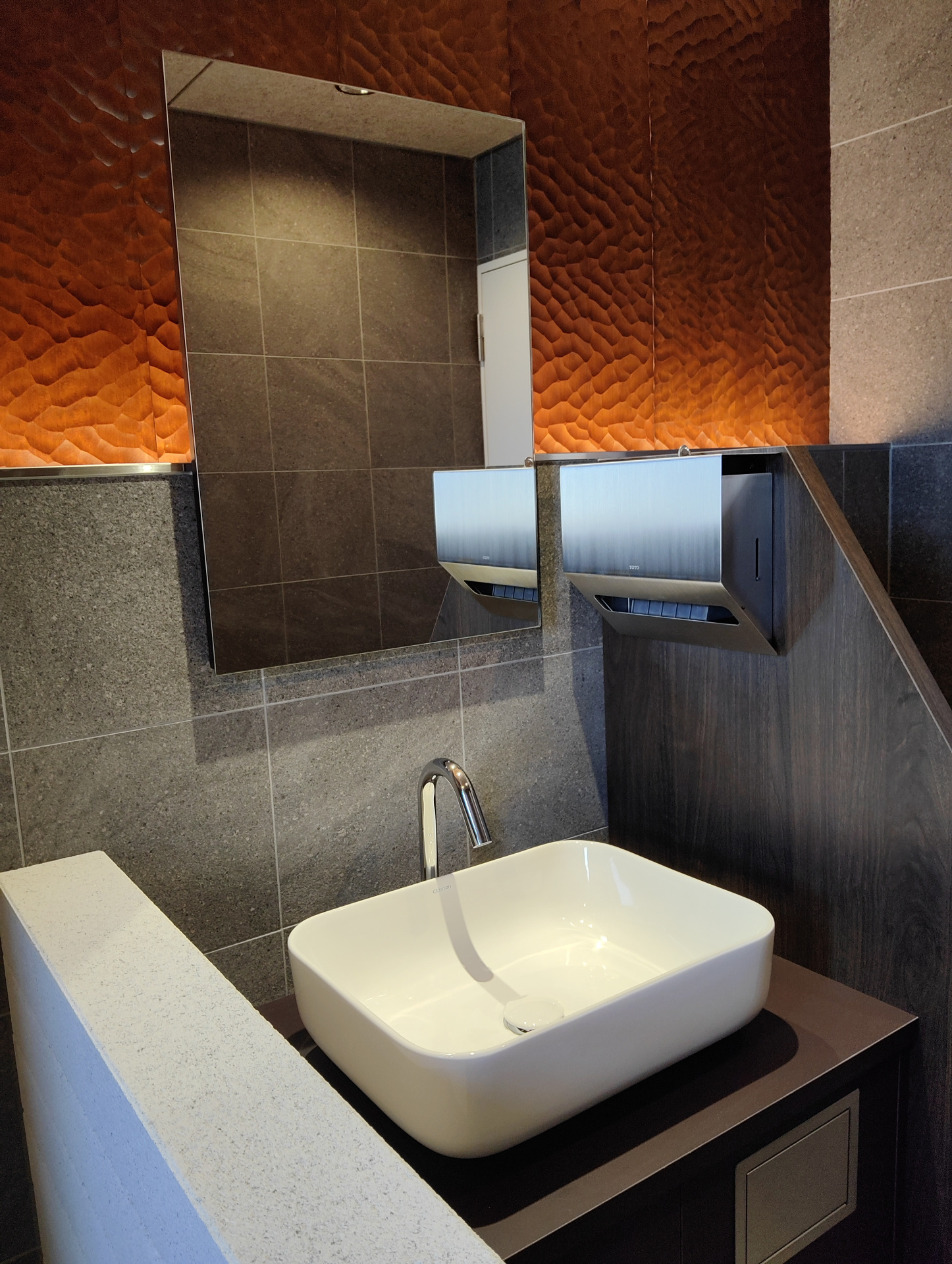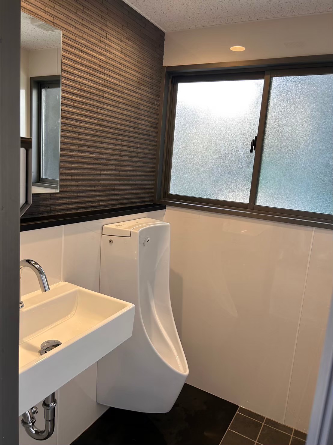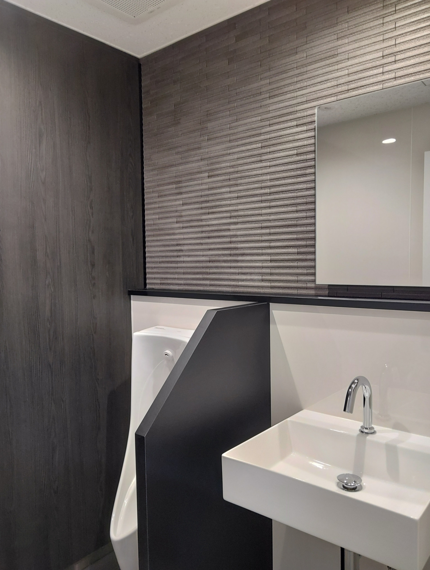 落ち着いたダークグレーのタイルに波打つような加工が施されたデザインウォール。間接照明を入れることで壁面の木目をさらに引き立て空間全体を上品な光で包み込みました。生コンを扱う企業様でしたので高級感のある素材の中にコンクリートブロックや木毛セメント板の天井などを使用し、遊び心と無機質なかっこ良さも加えました。天然木や木毛セメント板には調湿効果や消臭効果もありるので、トイレに使用する素材としては機能性もありオススメです。