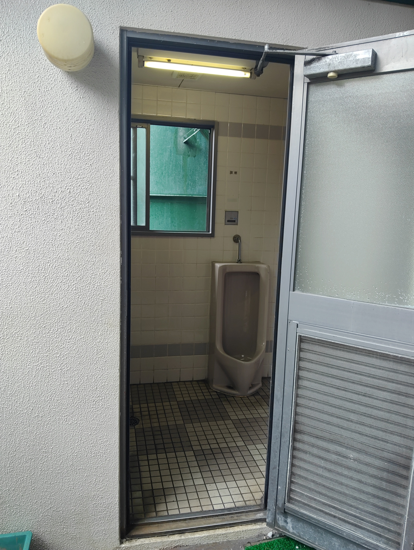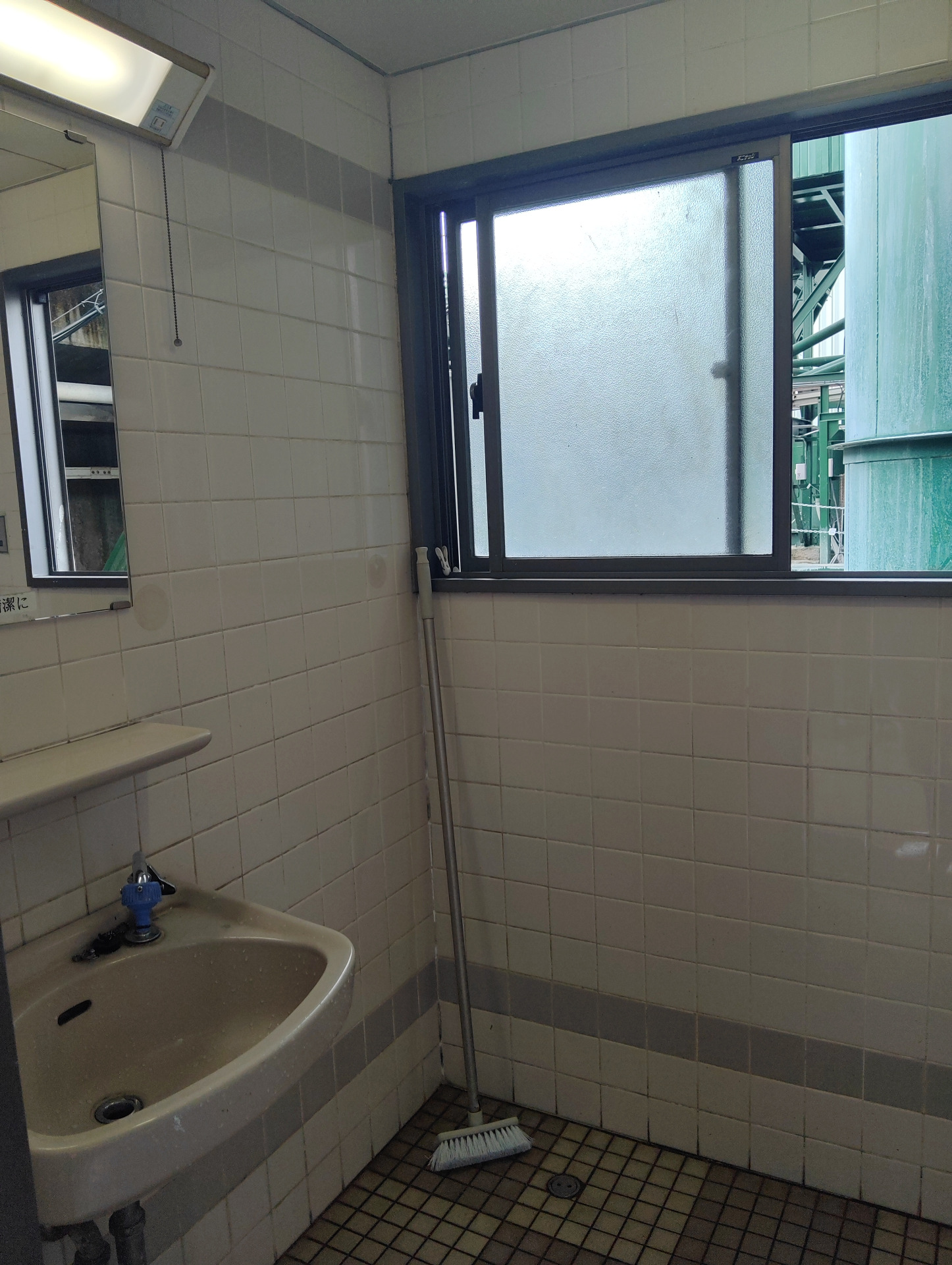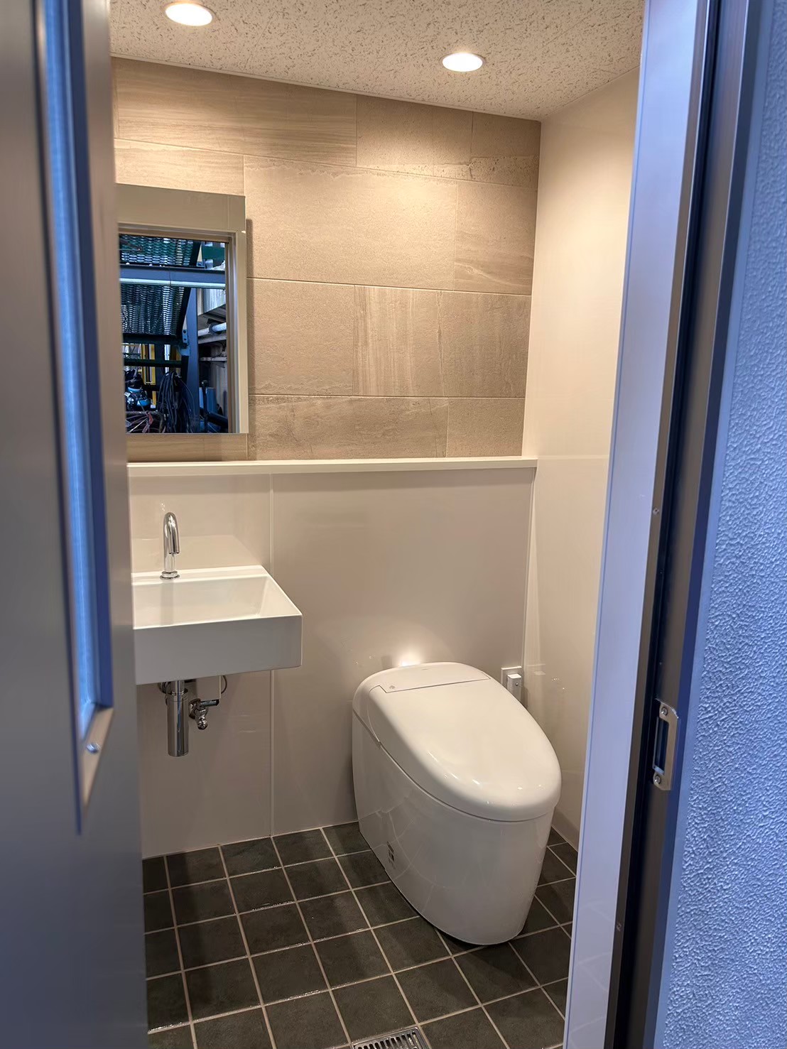 落ち着いたダークグレーのタイルに波打つような加工が施されたデザインウォール。間接照明を入れることで壁面の木目をさらに引き立て空間全体を上品な光で包み込みました。生コンを扱う企業様でしたので高級感のある素材の中にコンクリートブロックや木毛セメント板の天井などを使用し、遊び心と無機質なかっこ良さも加えました。天然木や木毛セメント板には調湿効果や消臭効果もありるので、トイレに使用する素材としては機能性もありオススメです。
