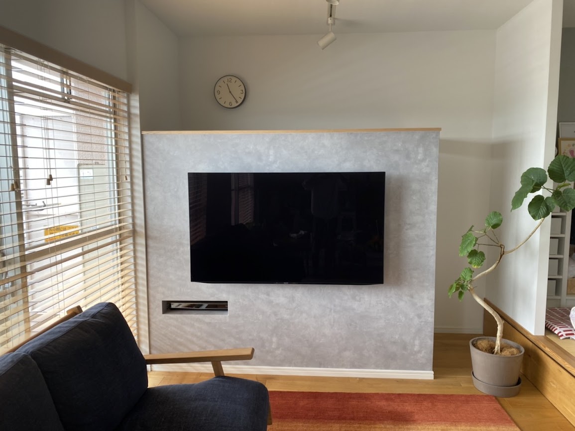 テレビを壁掛けにしたいのでテレビを掛けれる壁を作ってほしい、裏側は荷物を収納できるようにしたい。 DVDプレイヤーを収納できるようにしてほしい、とのご要望でした。