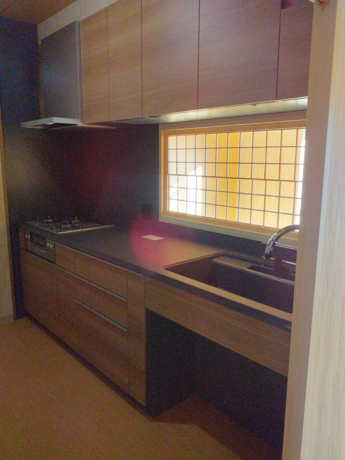 リビングと繋がるカウンターに雪見月見障子を設置いたしました。黒と木目を基調とした高級感のあるキッチンに仕上がりました。キッチン:LIXIL リシェル24