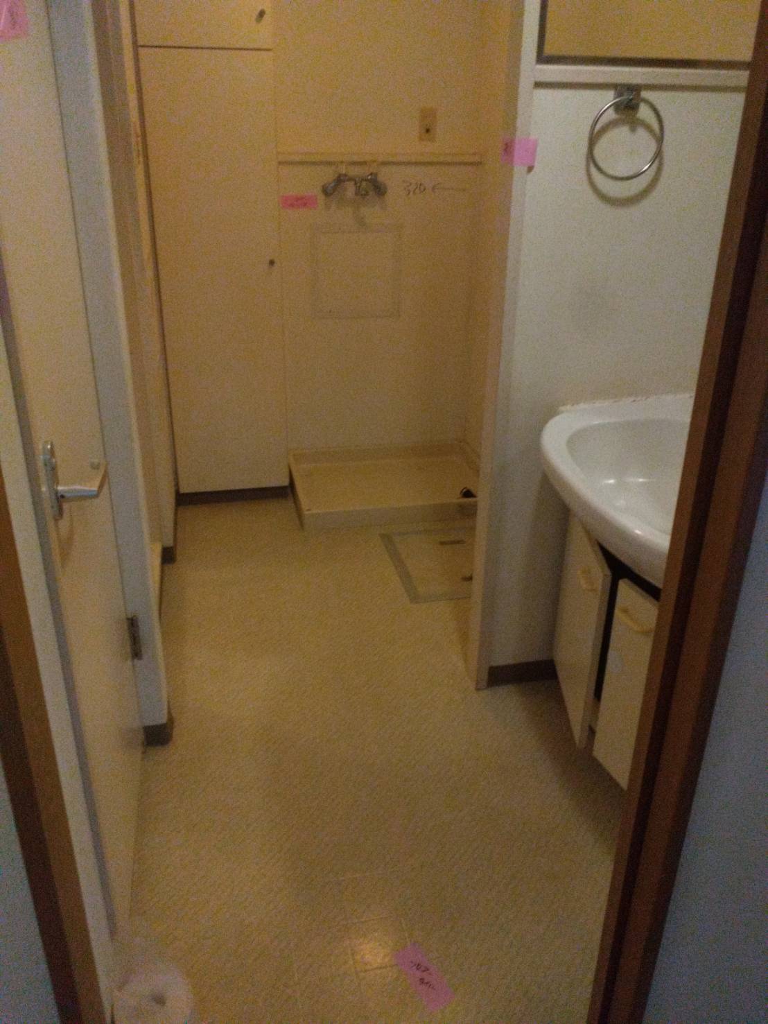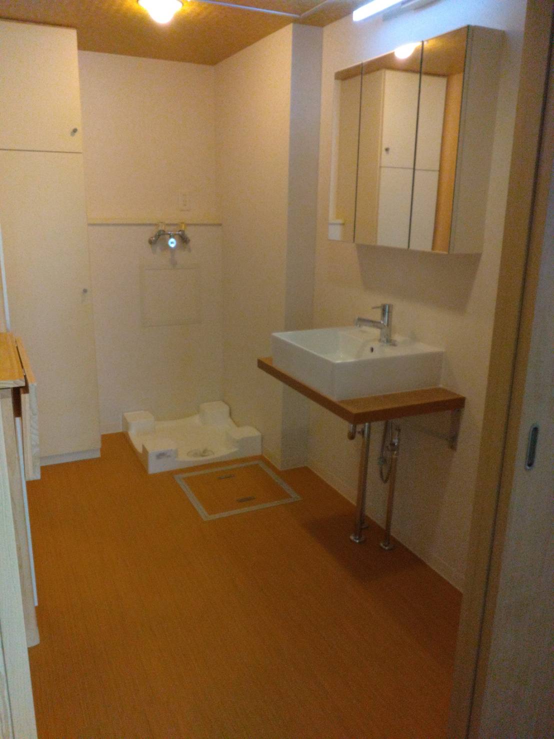 既存の棚、袖壁を撤去し広くすっきりとした洗面所になりました。洗面:LIXIL エスタ