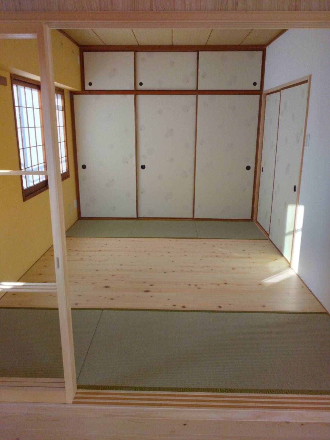 無垢板フローリング×い草畳を組み合わせたリビングと繋がる和室です。黄色のクロスがアクセントとなりお部屋を明るく彩ります。 畳おもて:国産麻綿 襖:ごりん66