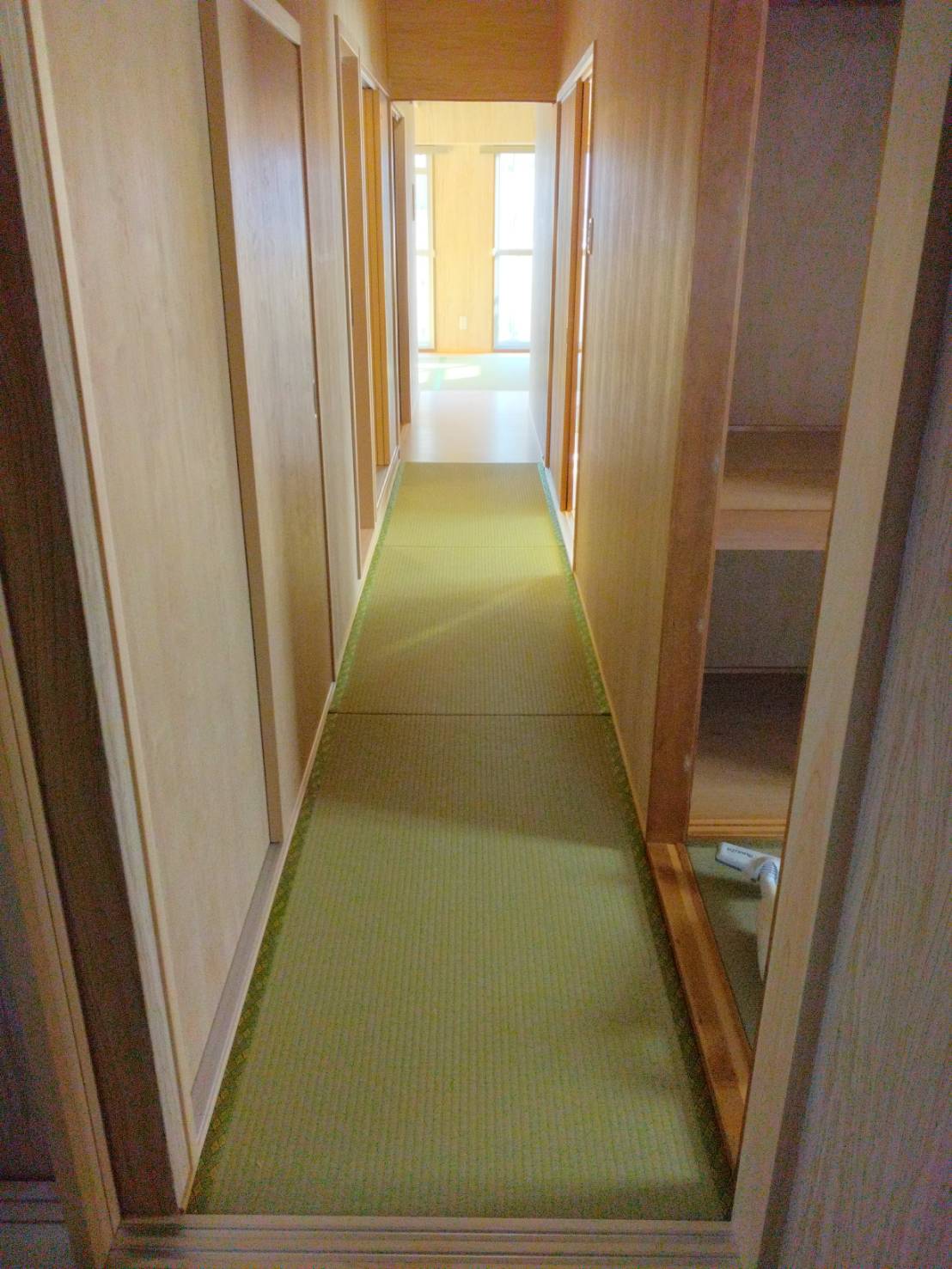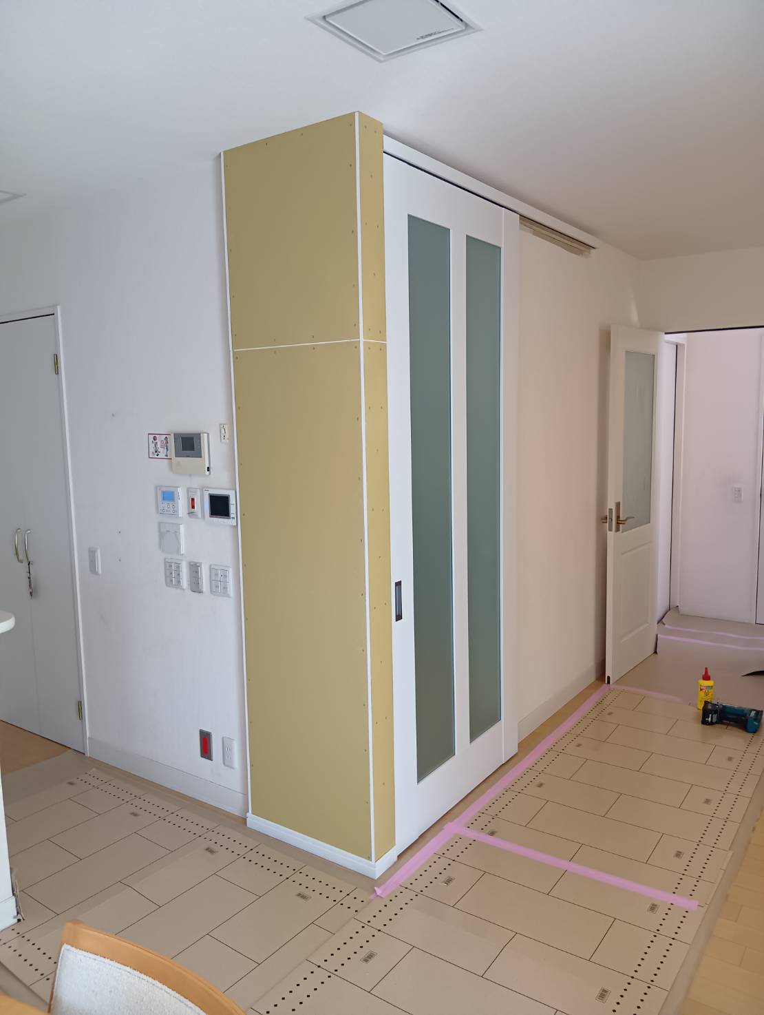 間仕切りは3枚建て(障子紙なし)です。 壁紙にはオリーブの木目調のクロス、天井には木目のクロスを貼らせていただきました。 畳:ダイケン和紙畳銀白 銀白色 玄関収納:LIXIL ラシッサ