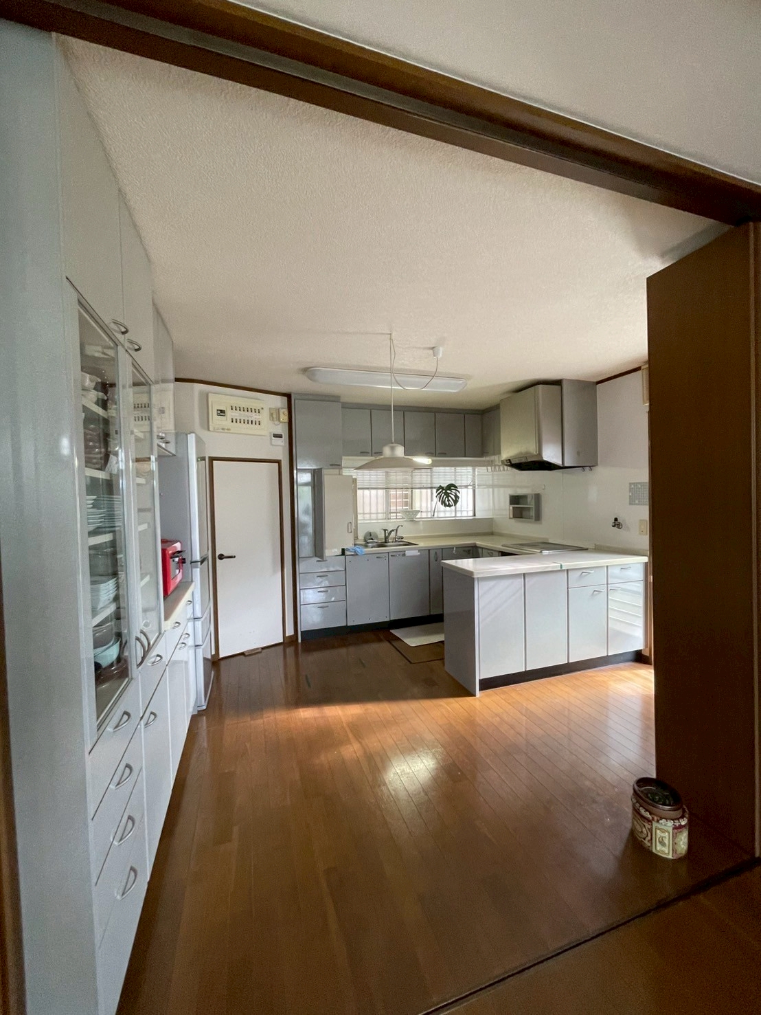 キッチンはリビング側から作業スペースが見えないようL型をI型に変更しました。内装を特にこだわりたいとのご要望でしたので、現代風をテーマにお施主様お好みの壁紙を選んでいただき素敵なダイニングキッチンになりました。