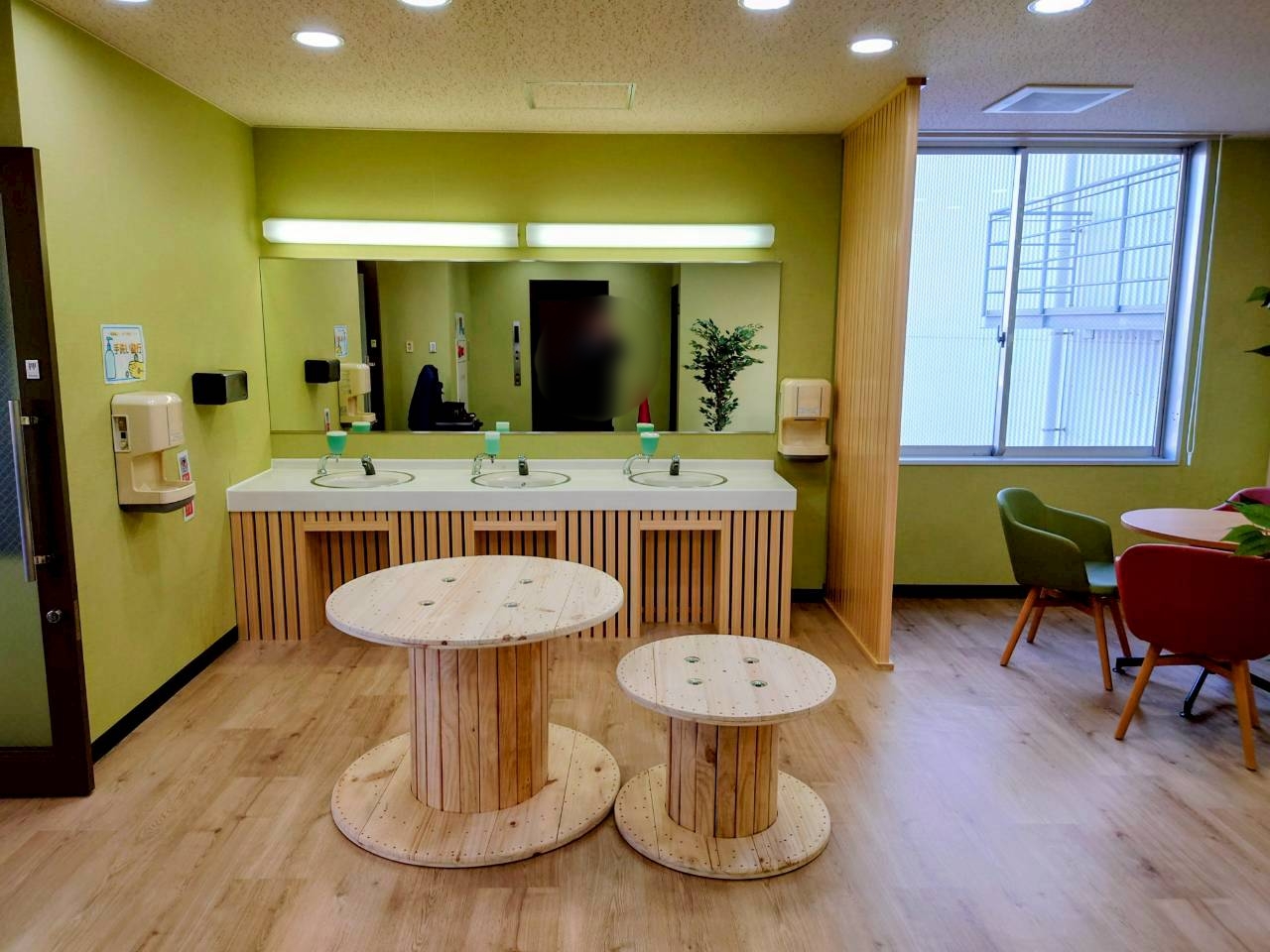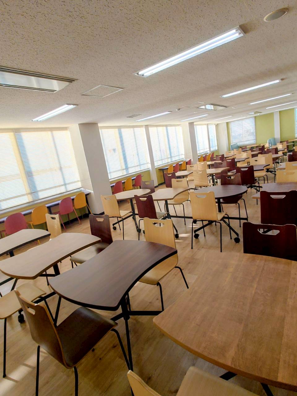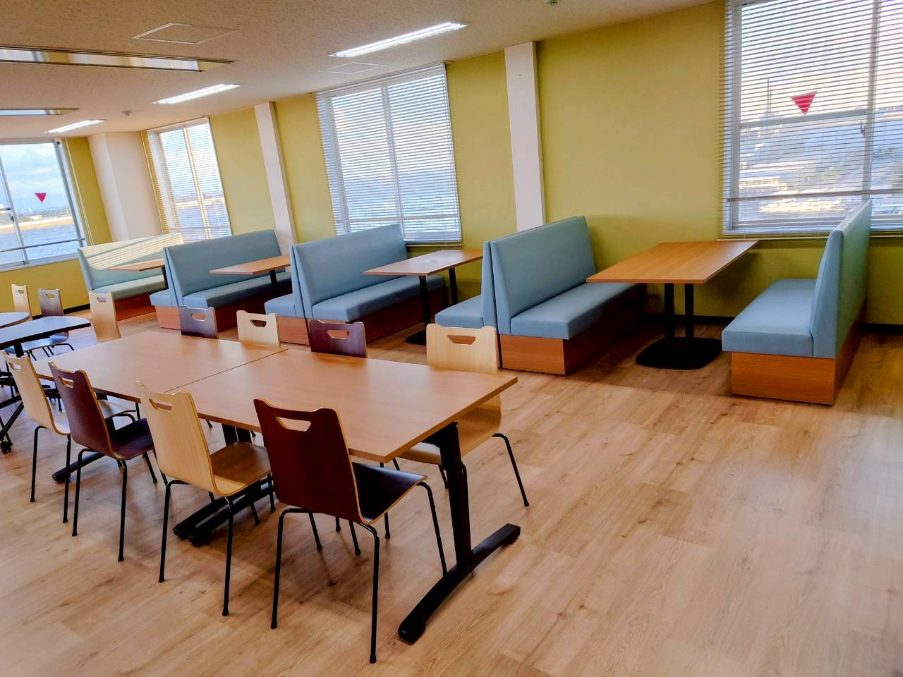 既存の優しい緑色のクロスに合わせて木目調の什器、床(床シート)を選択し、明るくナチュラルな食堂に生まれ変わりました。