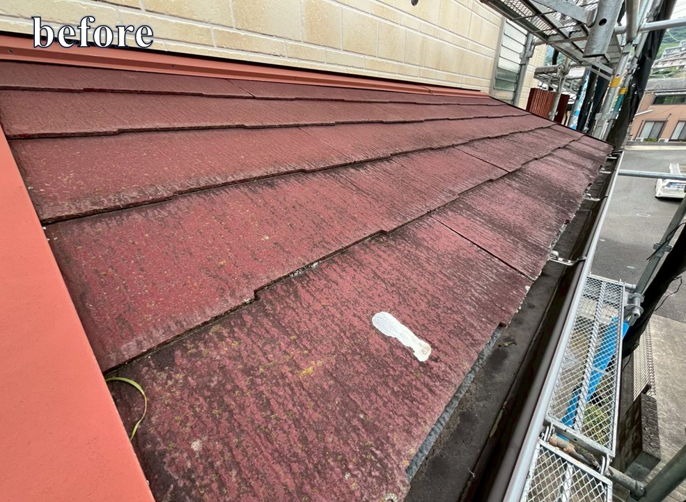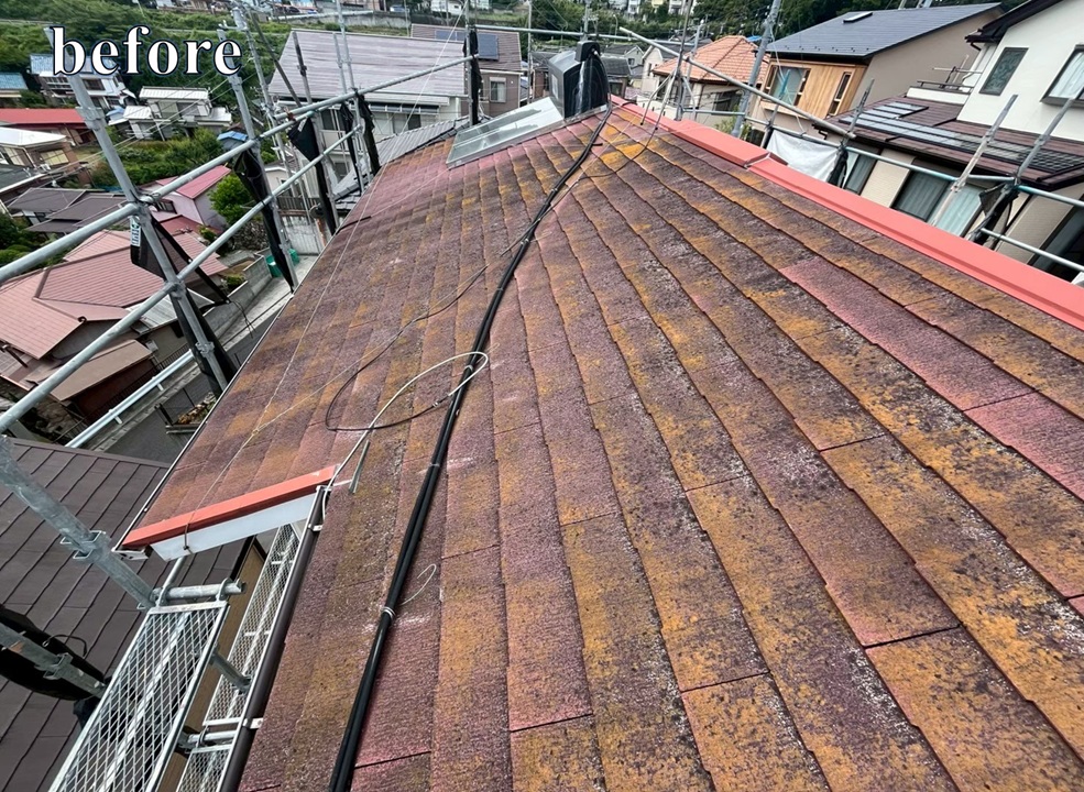 屋根全体が赤茶色に退色し、表面の保護機能が弱まっている状態でした。長年の紫外線や風雨の影響により防水性能の低下も懸念され、「雨漏りが起きる前に、早めにメンテナンスをしたい」とのご相談をいただきました。