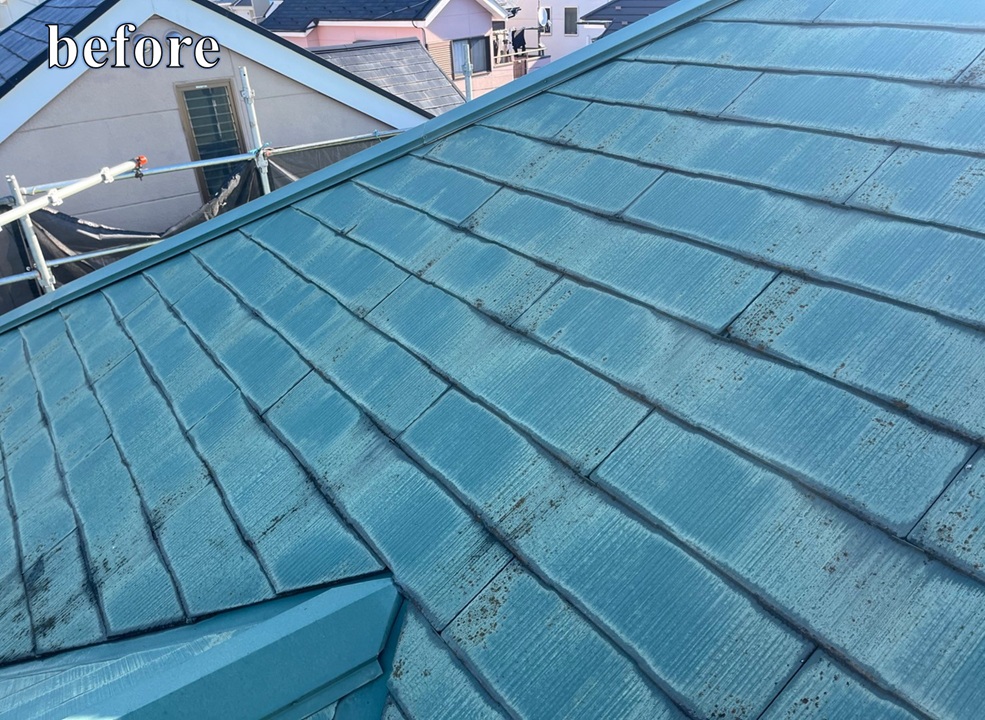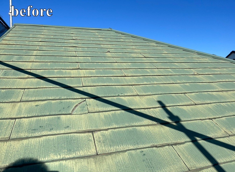 屋根の老朽化が気になるとのことでご相談をいただき、現地調査を行いました。 屋根の状態を確認したところ、スレート屋根全体に色褪せやコケの付着、ひび割れなどの経年劣化が見受けられました。 屋根は普段なかなか目にする機会が少ないため、現状のお写真をお見せしながら状態をご説明したところ、 「雨漏りが起きる前にしっかり対策をしておきたい」 とのお話をいただき、屋根のメンテナンス方法についてご相談をいただきました。