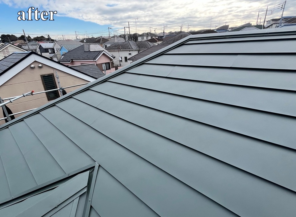 施工後は、屋根のひび割れやコケの付着が解消され、建物全体がきれいに整った印象になりました。 また、新しい金属屋根材を施工したことで防水性や耐久性が向上し、屋根の老朽化や雨漏りへの不安も軽減されています。 外観も落ち着いたグリーンの屋根に生まれ変わり、住まい全体の印象がより引き締まった仕上がりとなりました。 お客様からも「屋根がきれいになって安心しました」とのお言葉をいただき、これからも気持ちよくお住まいいただける住環境になりました。