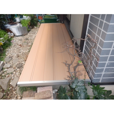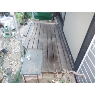 経年変化した既存材を撤去してアルミ濡れ縁とデッキ材取付