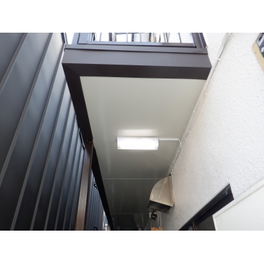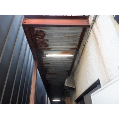 鉄骨通路H鋼を日鉄鋼板(株)ニスクカラーで板金加工し、アルミ板取付後に新規パナソニック(株)の照明取付工事