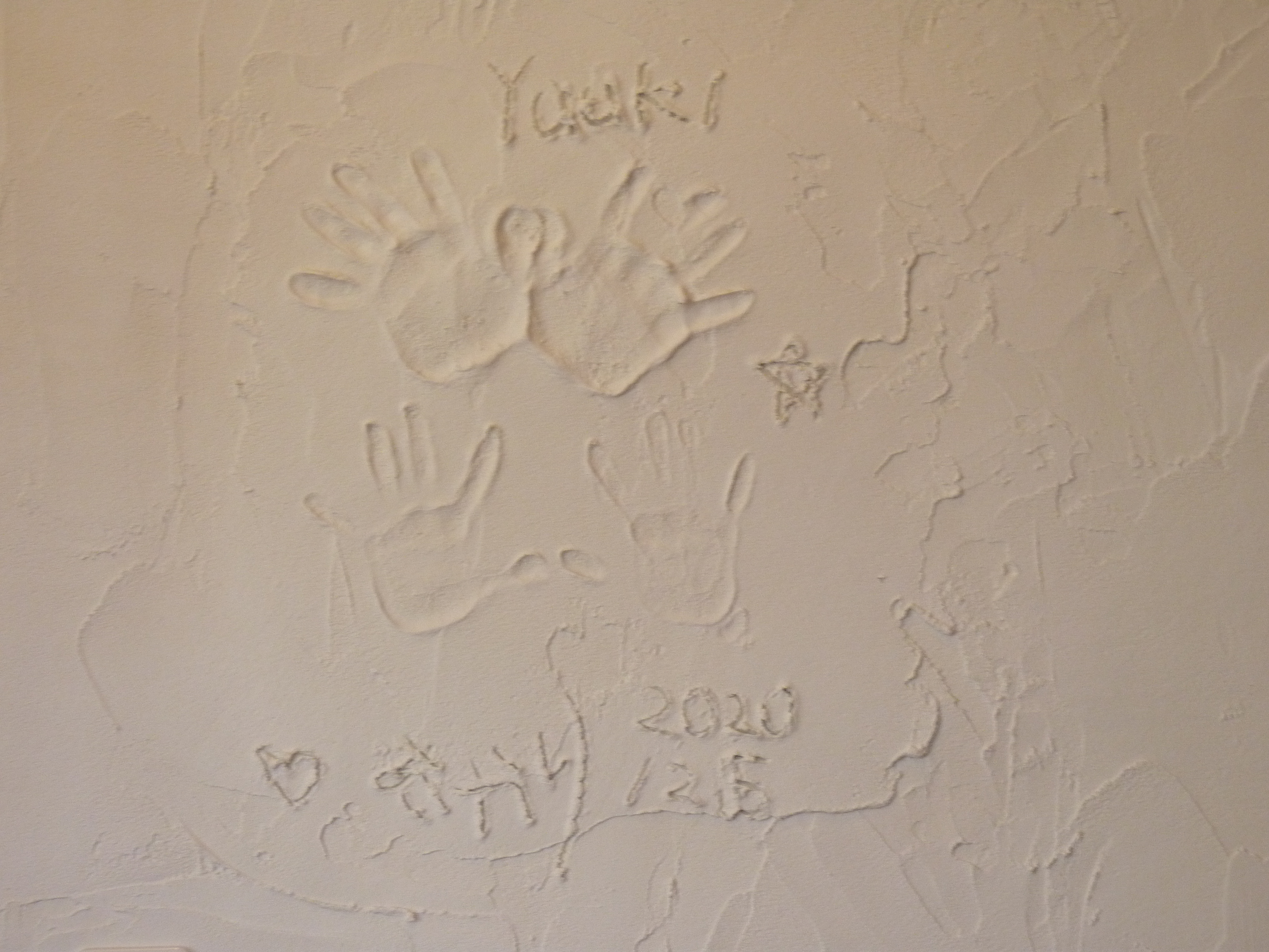 一緒に塗った壁に、手形を押し、名前と日付を書き込む。
