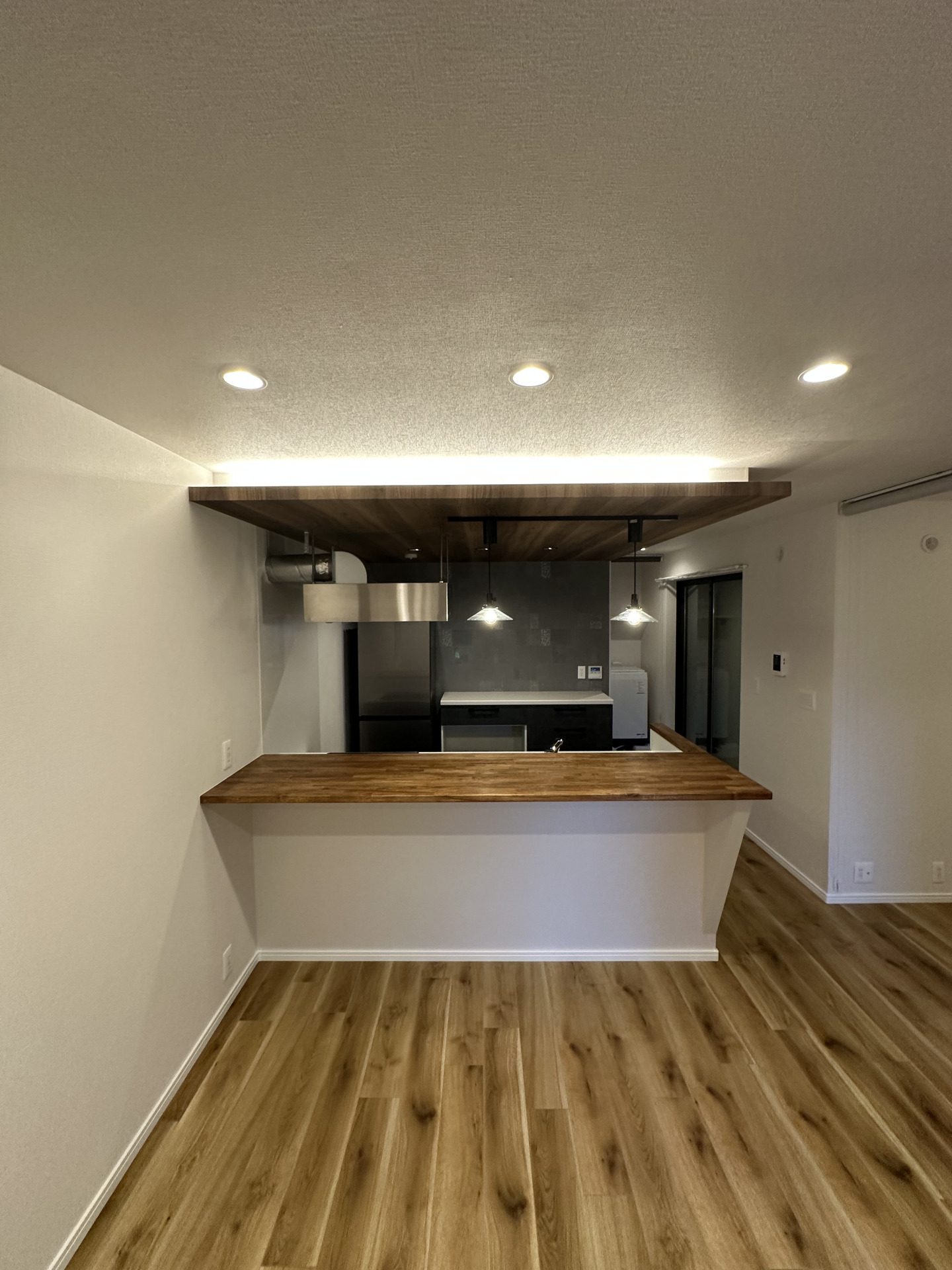 造作ドア 無垢フローリング ホームパーティができるリビング キッチンを広くしたい 塗り壁 OSBボード 玄関を広くしたい カフェのような空間