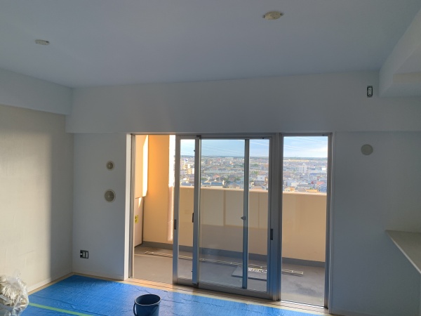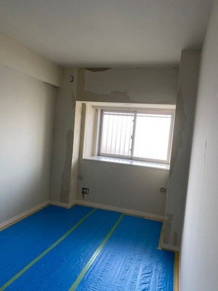 施工しない所の傷防止の養生とコンクリート壁の部分は下地調整とプライマー塗布でクロス剥がれの防止をしました。